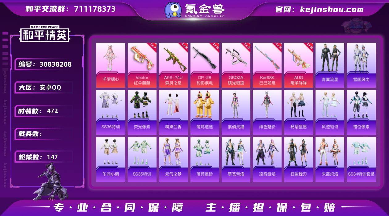热力值:42941 时装数:472 枪械数:147 战备数:97 游戏等级:54 卓越印记:1 传奇印记:0 绝世印记:0 羊梦糖心 七级Vector-红伞翩翩,五级AKS-74U-森灵之息,五级DP-28-豹影疾电,五级AUG-暖羊咩咩,五级GROZA-镜光银凌,五级Kar98K-巳巳如意 炫彩糖果降落伞,炫彩糖果飞行器,异瞳寒姬降落伞,魔童闹海 哪吒降落伞,碧影闪光降落伞,鬼刀降落伞,极限特训降落伞,蓝莓炮弹降落伞,童趣迷兔降落伞 青翼流星,雪国风尚,SS36特训,荧光像素,炫彩糖果,粉黛兰香,绯色魅影,萌鸡速递,紫俏灵猫,错位像素,风迹短诗,秘语星愿,SS35特训,午间小调,元气之梦,薄荷星砂,狂鲨锋刃,凌霄紫焰,擎苍青焰,SS34特训套装,朱霞炽焰,暗金炫舞,冰冻风暴,缤纷果语,冰河战士,爆裂葡萄,白色伏地魔,长空猛禽,春日漫步,蝶变,大橘大利,都市漫游者,飞驰魅影,格斗先锋,海岛探路者,虎虎生威吉莉,湖蓝色名流,海琴烟,幻世保卫者,黑色伏地魔,黄色名流,黄色运动,红色运动,幻世战舞者,酒红色名流,橘黑制服,竞技达人朋克,竞技名士,吉莉礼服,极速红龙,街头风暴,空岛之星,快乐星愿,空投萌叽,蓝冰羽,蓝调潮人,龙魂突击队,猎鹰,浪漫天命,蓝色运动,恋语绒绒,冷焰舞者,猛禽,米开朗基罗,魅力单车,麻辣教官,霓虹极客,霓虹街区,怒火燎原,柠萌假日,牛气满满,破蛋小黄鸡,破晓战魂,沁蓝冰爽,绮丽涂鸦,青年教官,青涩时光,骑行爱好者,青玉碎影,瑞龙福将,人气偶像,深蓝色名流,森林游猎者,SS17特训,SS19特训,SS20特训,SS21特训,SS22特训,SS23特训,SS25特训,SS26特训,SS27特训,SS28特训,SS30特训套装,SS31特训套装,SS32特训套装,SS33特训套装,巳巳如意,甜蜜告白,特训学院,团圆交子,特战装甲,完美偶像,王牌教练,旭日情侣,星渊小夜曲,音速流光,玉兔迎春,鹰眼刺客,鱼渊荷华,耀眼新星,燕燕于飞,异域银装,战地督导,智谋强哥,紫幽梦,灼焰舞者 ACE32-冰晶雪宝,Mk14-阳光菠萝,PKM-啾咪啾咪,AKS-74U-荧光像素,MK12-乌木金纹,PKM-荧光像素,SCAR-L-绿洲时空,AUG-冰晶雪宝,铝热弹-炫彩糖果,UZI-炫彩糖果,撬棍-冰晶雪宝,AKM-霓彩脉冲,Famas-霓彩脉冲,Mk14-紫晶流影,SLR-霓彩脉冲,SVD-霓彩脉冲,十字弩-异瞳寒姬,信号枪-异瞳寒姬,DBS-风迹短诗,M416-错位像素,蜜獾-风迹短诗,MK12-风迹短诗,Mk47-风迹短诗,莫辛纳甘-风迹短诗,汤姆逊-错位像素,破片手榴弹-拽到爆炸,S12K-霓彩脉冲,SCAR-L-彩虹符号,野牛-魔童闹海 敖闰,电击枪-喜羊羊与灰太狼,M249-冰晶雪宝,MG-36-薄荷星砂,P90-玩趣呆呆,AC-VAL-天降萌叽,AKM-龙的传人,AKM-霓虹街区,AKM-灼热熔岩,ARX-凌霄紫焰,AUG-天降萌叽,AUG-耀粉歌者,AWM-恐龙拽拽,大砍刀-鬼刀,DP-28-彩虹符号,Famas-突变脉冲,G36C-星穹咏叹调,GROZA-海盐豹豹,GROZA-影袭,JS9-凌霄紫焰,Kar98K-彩虹符号,Kar98K-飞驰魅影,Kar98K-蓝莓炮弹,Kar98K-王子的夏天,M16A4-冰河战士,M16A4-幻世战舞者,M200-乌木金纹,M249-彩虹符号,M249-破晓战魂,M24-影袭,M416-红色方程式,M416-蓝色火焰,M762-彩虹符号,M762-瑞龙福将,MG-36-凌霄紫焰,MG3-蓝晶绮麟,
