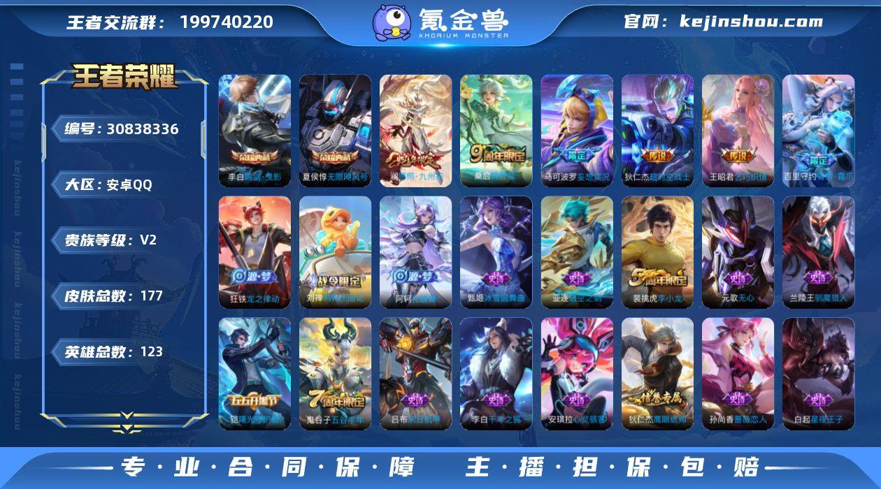 贵族等级:V0 典藏皮肤数:0 珍品无双皮肤数:0 无双皮肤数:0 珍品传说皮肤数:0 传说皮肤数:11 史诗皮肤数:50 皮肤数:157 英雄数:125 段位:星耀 卖家说:贵族1级 157皮肤,11传说,2星元,51史诗,41段打野,3个性按键, 【传说皮肤11】 后羿神树通天 桑启鸣野蒿 澜逐花归海 露娜霜月吟 娜可露露前尘镜 裴擒虎寅虎赤拳 曜李逍遥 镜炽阳神光 干将莫邪久胜战神 花木兰冠军飞将 宫本武藏地狱之眼; 【星元皮肤2】 宫本武藏幽冥之眼 百里玄策元气满满鸭; 【史诗皮肤51】 项羽九幽镇关 黄忠百相守梦 狂铁龙之律动 蔡文姬夏日便利店 女娲万灵启世 牛魔星界战将 姬小满妄想食味 蒙恬荣光圣徽 蒙犽百解令 阿古朵江河有灵 马可波罗山海玄木吟 梦奇顽趣 元歌无心 鬼谷子五谷丰年 澜赏金猎手 韩信傲雪梅枪 雅典娜黎明之约 庄周高山流水 孙悟空孙行者 西施诗语江南 裴擒虎李小龙 百里玄策原初追逐者 不知火舞魅语 韩信飞衡 大乔猫狗日记 白起星夜王子 程咬金功夫厨神 李元芳逐浪之夏 百里守约特工魅影 亚瑟心灵战警 诸葛亮黄金分割率 夏侯惇乘风破浪 花木兰水晶猎龙者 吕布末日机甲 雅典娜冰冠公主 李白千年之狐 廉颇地狱岩魂 赵云皇家上将 墨子金属风暴 孙尚香水果甜心 孙尚香蔷薇恋人 吕布圣诞狂欢 甄姬冰雪圆舞曲 宫本武藏鬼剑武藏 狄仁杰魔术师 貂蝉圣诞恋歌 露娜紫霞仙子 王昭君偶像歌手 狄仁杰鹰眼统帅 姬小满妄想食味 孙尚香蔷薇恋人; 【年限皮肤3】 裴擒虎寅虎赤拳 马可波罗山海玄木吟 韩信飞衡; 【内测皮肤4】 姬小满妄想食味 孙尚香蔷薇恋人 姬小满妄想食味 孙尚香蔷薇恋人; 【个性按键3】 神树通天 布丁狗之约 炽阳神光; 【主页装扮14】 元流之子 沙海飞舟 幻海映月 火鹰传说 东方来客 玉城之子 漂泊之剑 命运和弦 云梦有灵 命归缘起 群星启明 穿透信念 巅峰之路 命若星火; 【稀有英雄8】 _艾琳; _赵云; _韩信; _不知火舞; _娜可露露; _橘右京; _夏洛特; _敖隐;【138区】【可二次实名】【安卓QQ】【赛季】【国标、皮肤等详细信息以游戏内验号为准
