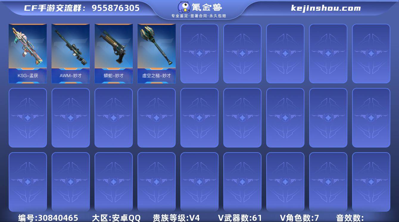 ABC9926/安卓QQ/贵4/可转区/钱包注销/可二次/61V不重复/7角色/90万化/妙才套/孟获/天龙魔神/零新生/审判者/冰封套