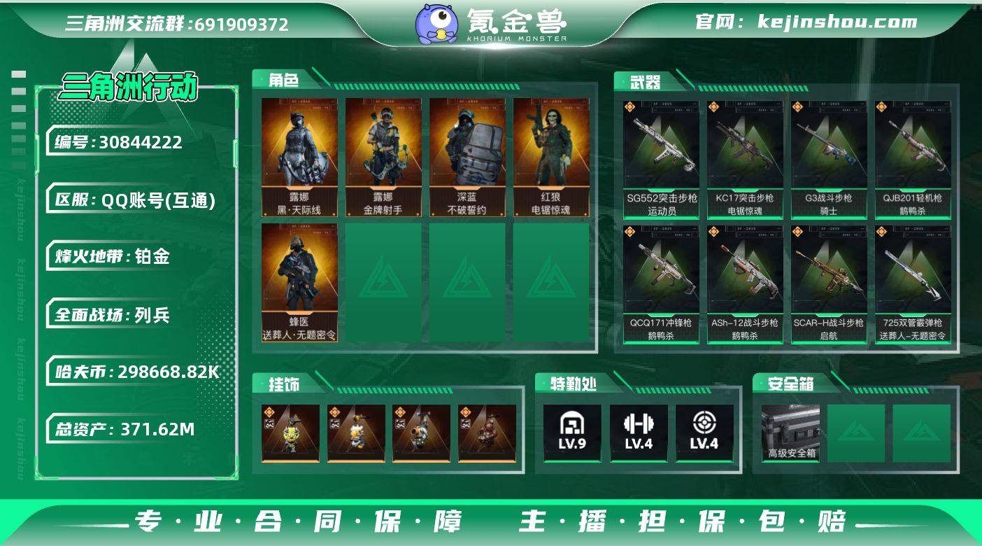 实名:不可二次实名 总资产:371.62M 哈夫币:298668.82K S7高级安全箱(2x3) 烽火地带段位:铂金 烽火地带等级:60 全面战场段位:列兵 全面战场等级:17 9级仓库,4级训练中心,4级靶场,0级潜水中心,0级收藏室