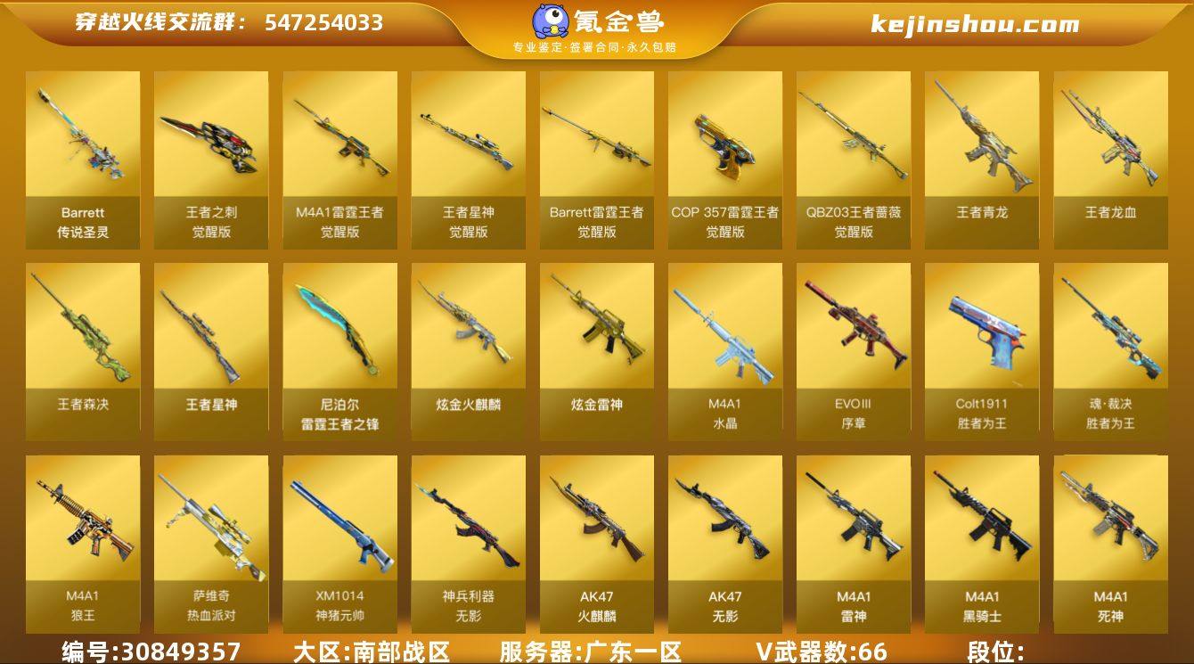 【自带包赔 最高三倍】:南部战区-Lv.100-大元帅-广东一区-66V-19王者-3炫金 【传说武器】:传说圣灵 【传说角色】:传说女帝 【热门武器】:G36C-幻影,金刚伞,M4A1-青龙,M200-幻神*2,M200-竞技荣光,Scar Light-白虎,死亡之眼,斯泰尔-蝴蝶,沙鹰-修罗*9,USP-雷暴,王者星神*2,王者森决 【特殊枪械】:蝴蝶斯泰尔+6烈龙,1白虎,1黑骑士,6烈龙,6盘龙,1炼狱,1蝴蝶斯泰尔 【王者炫金武器】:王者青龙,王者龙血,王者星神*2,王者森决,炫金火麒麟,炫金雷神*2,雷霆王者之锋*3 【音效卡】:M4A1-黑龙音效卡,M4A1-黑骑士音效卡 【皮肤】:幻神-周瑜皮肤,幻神-电流骇客 皮肤,火麒麟-盘古,火麒麟-心动糖果,毁灭-荣耀之怒,毁灭耀金皮肤,毁灭-风暴*2,黑龙-冠军之武,黑骑士-伏羲,雷神-虎将,龙啸-冠军之啸,擎天-冠军之击,无影耀金皮肤,黑龙-能量核心,修罗-能量核心,轻型军用手斧-再燃火线 【角色】:电竞教官-云悠悠,灵狐者-职业经理,瞳,王者-魅影,幽,修道士,云海玲珑,嘉年华灵狐,麻雀,潘多拉-甜心教官 【人偶武器】:AWM-灵狐-15周年嘉年华,巴雷特-零-水下丽影,斯泰尔-蝴蝶 【暴走生化】:死亡之眼 【挑战大师】:冰龙粉碎者-白马银枪*2,激光毁灭者III-白马银枪 【英雄级武器】:AK47-火麒麟*2,AK47-无影,Barrett-毁灭*5,Barrett-朱雀,加特林-炼狱,柯尔特-竞技荣光,龙啸,M4A1-黑龙*2,M4A1-雷神,M4A1-黑骑士,M4A1-死神*3,M4A1-玫瑰精灵,M200-幻神*2,M200-竞技荣光,擎天,麒麟刺*2,擎天-竞技荣光,RPK-盘龙*7,沙鹰-修罗*9,沙鹰-天神,汤姆逊-烈龙*7,屠龙*3,USP-雷暴,M4A1-青龙,Scar Light-白虎,无影-神兵利器,G36C-幻影,M4A1-雷霆王者-觉醒版,QBZ-03-王者蔷薇-觉醒版,Barrett-金色蔷薇,Barrett-雷霆王者-觉醒版,王者星神-觉醒版,COP 357...