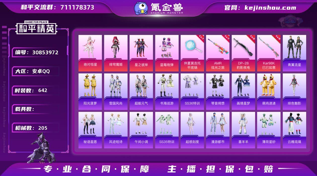热力值:57421 时装数:642 枪械数:205 战备数:144 游戏等级:60 卓越印记:2 传奇印记:1 绝世印记:0 绝对恒星,绯穹魔姬,蓝莓炮弹,星之彼岸 七级AMR-炫光之旅,七级平底锅-仲夏莫吉托,五级DP-28-豹影疾电,五级Kar98K-巳巳如意 绝对恒星降落伞,绝对恒星飞行器,炫彩糖果降落伞,炫彩糖果飞行器,星之彼岸飞行器,暗夜鎏金降落伞,幻彩电音降落伞,未来歌姬降落伞,仲夏莫吉托降落伞 青翼流星,阳光菠萝,雪国风尚,超能元气,画境星梦,琴音绮想,书海巡游,SS36特训,炫彩糖果,绯色魅影,萌鸡速递,风迹短诗,秘语星愿,SS35特训,午间小调,超感刻度,漫游都市,喜羊羊,薄荷星砂,云魄琉璃,狂鲨锋刃,凌霄紫焰,SS34特训套装,游乐,朱霞炽焰,暗黑骑手,冰川特警,缤纷果语,滨海厨神,白兰地假日,白糯汤圆,白色伏地魔,白熊同盟,春光漫游,彩虹兔,长空猛禽,超能勇士,春日漫步,纯真浪花,顶瓜瓜,大橘大利,都市魅力,风暴特警,绯格组合,飞行日记,光之冒险,幻彩翩翩,海岛探路者,鹤鸣,湖蓝色名流,海琴烟,黑色伏地魔,黄色伏地魔,黄色名流,黄色运动,红色运动,幻世战舞者,幻羽潜行,幻影武者,极地朋克,酒红色名流,惊鸿侠骨,橘黑制服,娇憨猪猪,竞技达人朋克,竞技角斗士,竞技名士,极速光影,极速红龙,精神漫游,街头潮人,街头风暴,锦衣飞扬,酷潮明星,空岛之星,快乐星愿,快闪甜心,蓝冰羽,蓝彩潮人,龙的传人,猎鹰,黎明保卫者,龙舌兰冰茶,蓝色运动,恋语绒绒,冷焰舞者,猛禽,妙红点点,萌黄之夏,魅力单车,懵萌河马,萌趣咩咩,霓虹街区,柠萌假日,牛气冲天,牛气满满,破蛋小黄鸡,破晓战魂,轻风白浪,绮丽涂鸦,青年教官,青涩时光,青团波波,清新柠檬,青玉碎影,云朵鹅,荣耀,热情海星,人气偶像,燃烧卡路里,深蓝色名流,森林游猎者,神气柴柴,SS19特训,SS20特训,SS21特训,SS22特训,SS23特训,SS24特训,SS25特训,SS26特训,SS27特训,SS28特训,SS31特训套装,SS32特训套装,SS33特训套装,巳巳如意,探宝勇士,特殊使命,糖糖葫芦,特训学院,田园牧歌,特战装甲,完美偶像,王牌教练,顽皮玉兔,炫蓝之夏,星梦畅游,雪绒豹,旭日情侣,夏日音浪,星途旅人,耀粉歌者,阳光火鸡,玉兔迎春,焰鹰斗篷,鱼渊荷华,幽夜迷踪,燕燕于飞,异域银装,战地督导,智慧之神,智谋强哥,紫幽梦,灼焰舞者 ACE32-冰晶雪宝,Mk14-阳光菠萝,PKM-啾咪啾咪,AA12-G-画境星梦,ACE32-画境星梦,AUG-绝对恒星,M1加兰德-画境星梦,MK12-乌木金纹,MP5K-画境星梦,平底锅-画境星梦,UMP45-极意拳锋,铝热弹-炫彩糖果,UZI-炫彩糖果,撬棍-冰晶雪宝,AKM-霓彩脉冲,Famas-霓彩脉冲,Mk14-紫晶流影,SLR-霓彩脉冲,SVD-霓彩脉冲,十字弩-异瞳寒姬,DBS-风迹短诗,蜜獾-风迹短诗,MK12-风迹短诗,Mk47-风迹短诗,莫辛纳甘-风迹短诗,破片手榴弹-拽到爆炸,S12K-霓彩脉冲,AUG-紫晶流影,AMR-喜羊羊与灰太狼,爆炸猎弓-喜羊羊与灰太狼,M249-冰晶雪宝,MG-36-薄荷星砂,P90-玩趣呆呆,突击盾牌-绝对恒星,AA12-G-纯真浪花,AC-VAL-彩虹甜喵,AC-VAL-快闪甜心,AC-VAL-天降萌叽,AKM-彩虹符号,AKM-虎虎生威,AKM-龙的传人,AKM-霓虹街区,AKM-星之彼岸,AKM-灼热熔岩,AKS-74U-鸡智如我,AMR-妙红点点,ARX-凌霄紫焰,AUG-天降萌叽,