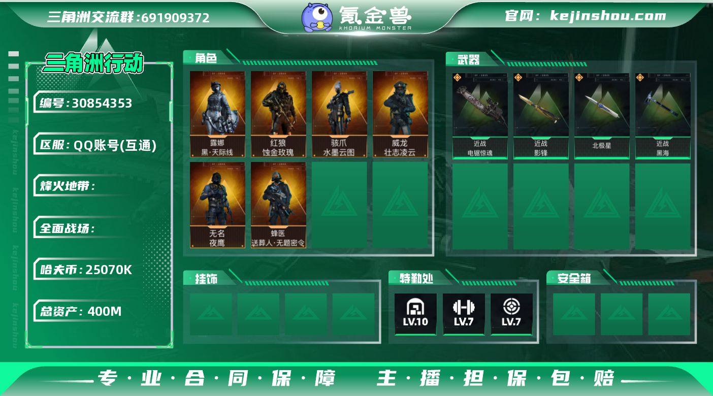 S932 总资产400M,哈夫币2507w,近战5 枪皮数量246,露娜-黑天际线/红狼-蚀金玫瑰/骇爪-水墨云图/无名-夜鹰/威龙-壮志凌云/蜂医-送葬人无题密令,近战-北极星/近战-黑海/近战-影锋/近战-电锯惊魂,战场等级44校官, 行动等级60铂金,安全箱等时效性道具请以游戏内数据为准,详情请看图
