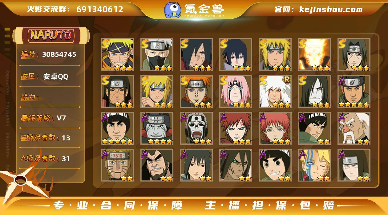 实名: 可修改 贵族等级: V7 S忍数: 13 A忍数: 31 亮点: 【XY102】V7/S忍13/A忍31/四星A-干柿鬼鲛/二星A-日向宁次·忍界大战/二星A-大野木「侠隐江湖」/二星A-达鲁伊「五代目雷影」/二星A-宇智波鼬/三星S-宇智波佐助「永恒万花筒」/五星A-猿飞阿斯玛/三星S-旗木卡卡西「须佐能乎」/三星S-佩恩「天道」/三星S-漩涡鸣人·宇智波佐助/三星S-波风水门/三星A-蝎/三星S-漩涡鸣人 「九喇嘛连结」/三星S-波风水门「秽土转生」/二星A-秋道丁次「忍界大战」/二星A-角都「秽土转生」/五星A-迈特凯/二星A-漩涡博人「桃式显现」/二星A-奇拉比「忍界大战」/三星S-千手柱间「秽土转生」/三星A-我爱罗「疾风传」/二星A-李洛克「忍界大战」/二星A-长十郎「六代目水影」/二星A-波风水门 「青年」/三星S-自来也「舞之豪杰」/二星A-佩恩·六道「漂泊浪客」/二星A-宇智波带土「暴怒」/二星A-黑土「四代目土影」/二星A-奇拉比/二星A-飞段/二星A-神农 「羁绊」/三星A-飞段「死司凭血」/二星A-漩涡鸣人「仙人模式」/三星S-春野樱 「忍界大战」/二星A-宇智波佐助「万花筒写轮眼」/二星A-宇智波泉奈/三星S-大蛇丸/三星S-宇智波斑「秽土转生·解」/二星A-漩涡鸣人「九尾查克拉」/二星A-迈特凯「青春爆炸」/二星...