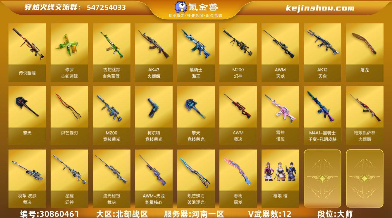 段位:大师 V武器数:12 传说幽瞳 修罗-古蛇迷踪,金色蔷薇-古蛇迷踪,AK47-火麒麟,黑骑士-海王,M200-幻神,AWM-天龙,AK12-天启,屠龙,擎天,炽芒蝶刃,M200-竞技荣光,柯尔特-竞技荣光,擎天-竞技荣光,裁决 枪娘 樱