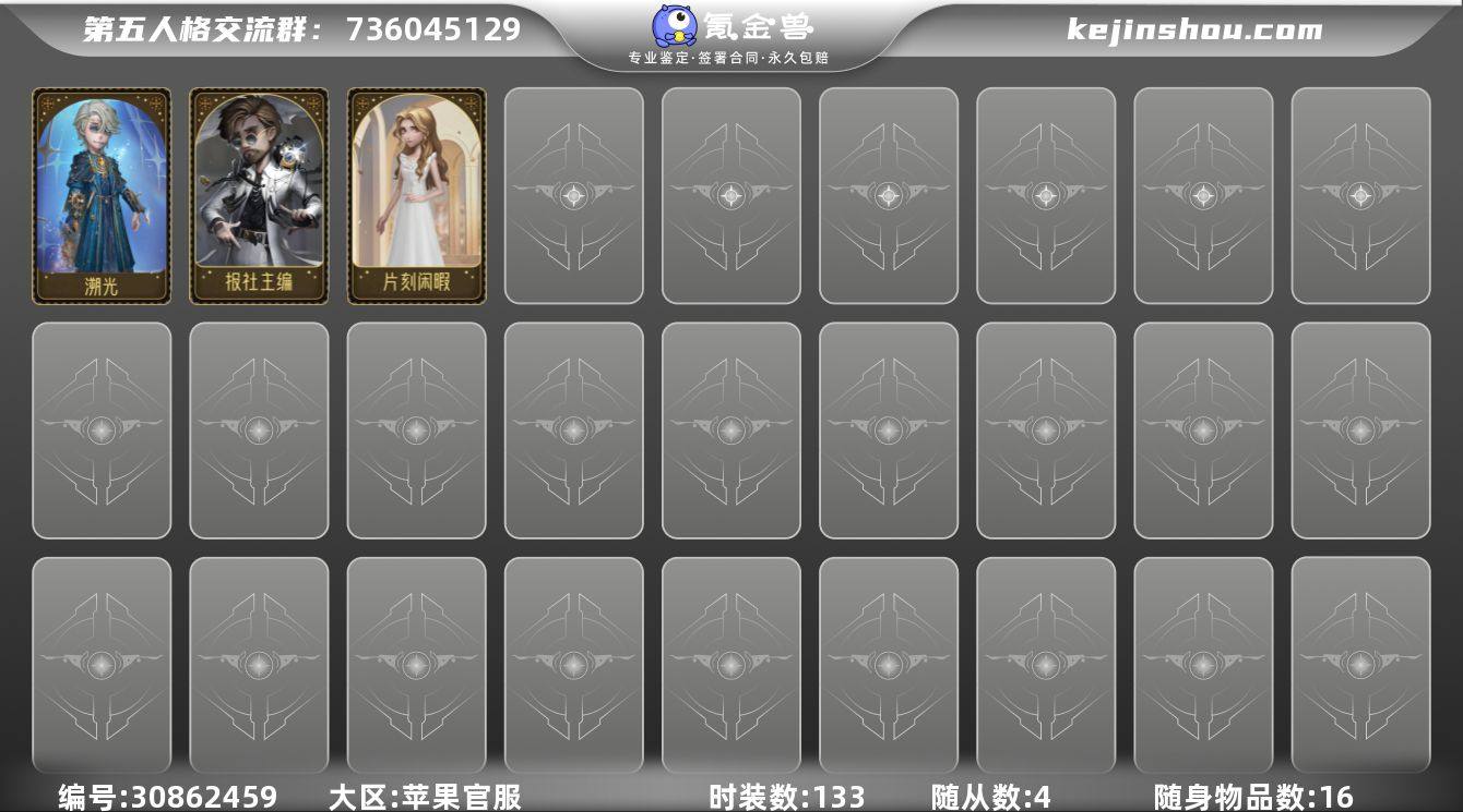 GDW337 苹果官服 随从4 时装133 随身物品16 角色等级17 报社主编 溯光 片刻闲暇 第五人格账号