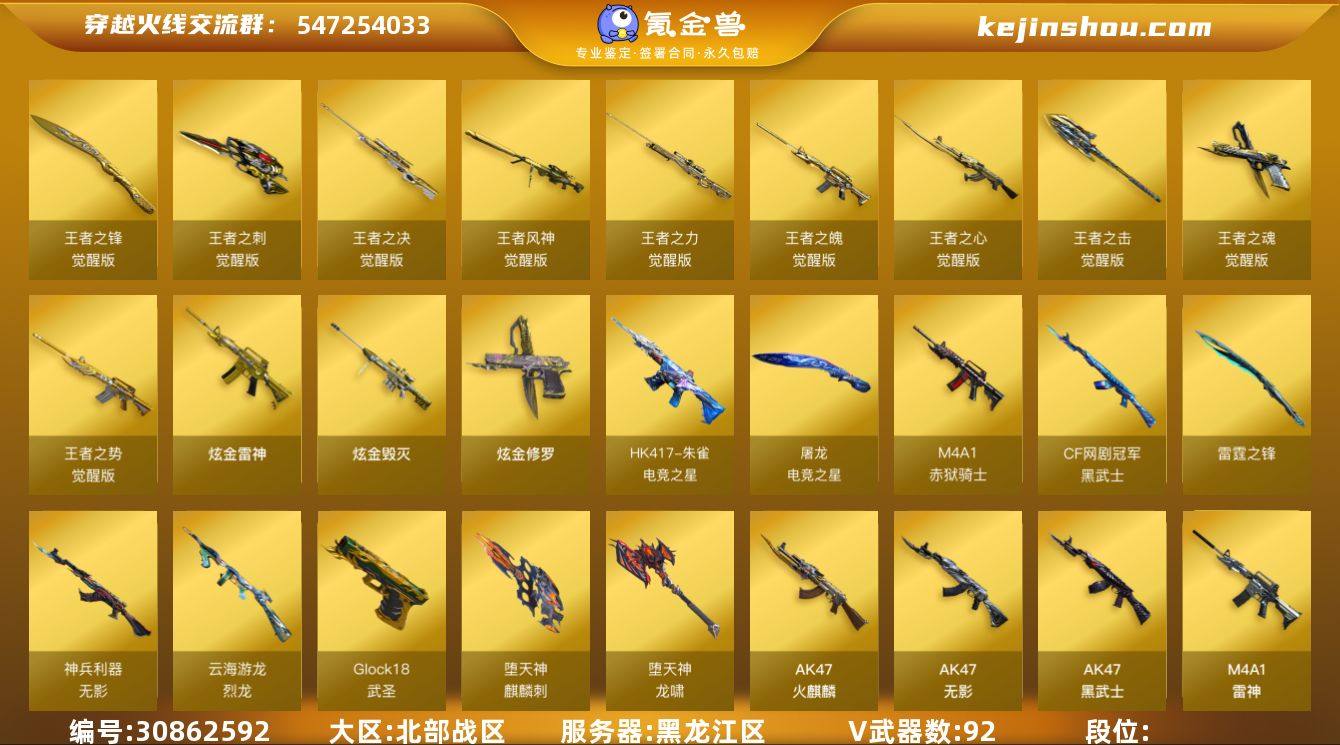 北部战区(黑龙江区)lb【精品爆破号】92v【M200-幻神+双皮/动感闪耀/黄忠,王者风神,武圣套装,动感闪耀套装,M14EBR-玄武,ScarLight-白虎+皮/大汉风骨,HK417-朱雀,M4A1-神工天巧,QBZ03-金色蔷薇+皮/枪娘阿敏,白虎-电玩蓝兔,AWM-裁决,Glock18-武圣,柯尔特-电竞装甲,USP-神工天巧,5修罗+异变清道夫,金刚伞-电玩红兔,猫猫手套】11全觉醒王者【王者风神,王者之心,王者之魄,王者之势,王者之决,王者之力,王者之魂,王者之刺,王者之锋】5炫金【炫金雷神,炫金毁灭,炫金修罗】14角色【荒漠琉璃,兰-巾帼英雄,零,迷迭香,枪娘樱,樱,魅影,幻面灵狐,乔伊教练,四防王者-零-国色天香,王者之瞳,新海豹突击队,修道士,云海玲珑,暗夜审判】7音效【AK47-火麒麟音效卡,M4A1-雷神音效卡,屠龙-云海游龙音效卡,M4A1-黑骑士音效卡,Barrett-毁灭音效卡,屠龙-电竞之星-竞星跃动音效卡,HK417-朱雀-电竞之星-竞星跃动音效卡】40皮【幻神-动感闪耀,幻神-黄忠,白虎-大汉风骨,QBZ03-枪娘阿敏,死神-机甲刑天,雷神-宇航兔,雷神-星空,黑骑士-电玩青兔,火麒麟-雷神,毁灭-耀金,修罗-CFS2018,毁灭-CFS2018,M4A1-战神赵云,黑龙-墨子,火麒麟-华夏之心,毁灭-CFS2020,雷神-虎将,火麒麟-AG战队,火麒麟-冠军之心,天龙-传奇白鲨,雷神-白鲨-CFPLS14冠军,黑武士-361,雷神-动感闪耀,雷神-云海游龙,屠龙-春桃,黑龙-361】小人物枪【天龙-曼陀罗,Barrett-夜玫瑰】 截图展示段位不代表实际段位 如赛季更新等不可抗拒因素发生变化、时限道具不保证所剩时间