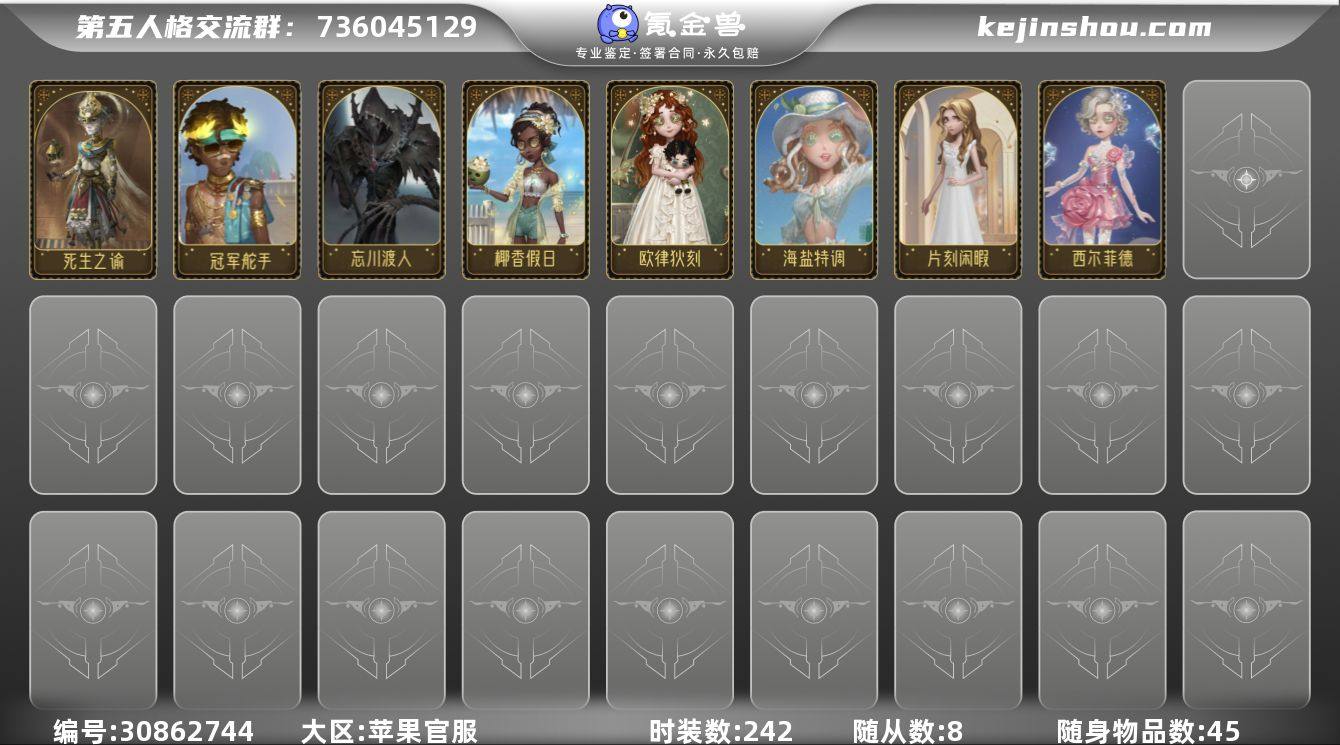 GDW587 苹果官服 时装242 随身物品45 随从8 角色等级29 死生之谕 忘川渡人 冠军舵手 海盐特调 椰香假日 西尔菲德 欧律狄刻 片刻闲暇 第五人格账号