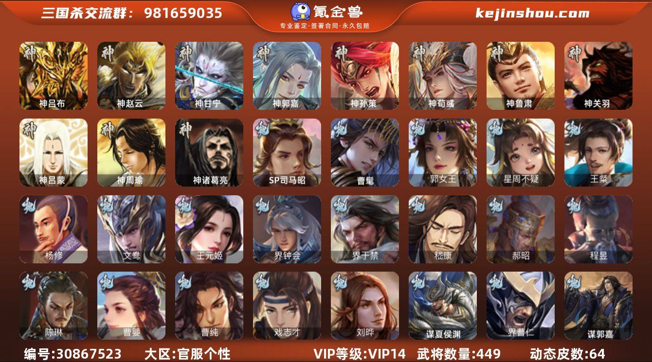 VIP等级: VIP14 官阶: 大将军 武将数量: 449 动态皮肤数量: 64 神将: 神甘宁,神郭嘉,神吕布,神孙策,神荀彧,神赵云,神关羽,神吕蒙,神周瑜,神诸葛亮,神鲁肃 魏国武将: 刘晔,戏志才,曹纯,曹婴,陈琳,程昱,郝昭,嵇康,界于禁,界钟会,王元姬,文鸯,杨修,王粲,唐咨-魏,张辽,SP蔡文姬,SP曹仁,SP关羽,SP贾诩,SP姜维,SP庞德,卞夫人,蔡贞姬,曹昂,曹操,曹冲,曹洪,曹丕,曹仁,曹叡,曹嵩,贾逵,王异,张恭,鲁芝,界满宠,曹休,界曹植,满宠,荀攸,王基,钟繇,蒯越蒯良,郭嘉,牵招,荀彧,阮慧,杜畿,界郭嘉,崔琰,界曹丕,界荀彧,朱灵,界甄姬,吕虔,界王异,界许褚,界郭淮,华歆,陈群,界邓艾,界典韦,袁涣,李通,乐进,辛宪英,郭淮,界曹彰,郭皇后,毌丘俭,夏侯惇,曹植,司马朗,谋于禁,界曹操,星周不疑,许褚,界张辽,谋徐晃,张郃,钟会,文聘,郭女王,曹彰,界夏侯惇,诸葛诞,司马懿,甄姬,杨阜,界徐晃,徐晃,界曹仁,孙资刘放,韩浩史涣,胡班,曹真,典韦,界夏侯渊,夏侯渊,李典,于禁,王双,邓艾,界司马懿,张春华,孟达-魏,臧霸,牛金,朱灵(国战),曹髦,SP司马昭,司马伷,董昭,谋郭嘉,谋夏侯渊 蜀国武将: 董允,关索,花鬘,界黄忠,沙摩柯,王平,张星彩,赵襄,诸葛瞻,谋马超,谋赵云,谋黄忠,马云騄,谋黄月英,徐庶,界魏延,杨仪,吕凯,界关羽,界诸葛亮,邓芝,界伊籍,胡金定,费祎,严颜,界黄月英,界张嶷,赵云,张松,彭羕,李丰,界刘备,谋法正,界刘禅,谋姜维,刘封,糜竺,李遗,谋庞统,黄月英,刘巴,关羽,王甫赵累,吴懿,吴班,界廖化,祝融,张飞,黄皓,魏延,界周仓,谋祝融,马忠,界法正,糜夫人,界孟获,刘禅,界赵云,谋诸葛亮,界姜维,张翼,关银屏,界祝融,SP孙尚香,SP徐庶,卧龙诸葛,宗预,周仓,简雍,界关兴张苞,诸葛亮,孙乾,界张飞,界卧龙诸葛,法正,界简雍,赵统赵广,陈到,界马岱,关平,马岱,界庞统,庞统,诸葛果,谋张飞,马谡,马超,霍峻,廖化,关兴张苞,谋关羽,孟获,秦宓,吴苋,夏侯氏,姜维,黄忠,刘备,界马超...