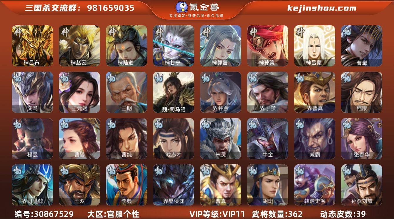 VIP等级: VIP11 官阶: 大将军 武将数量: 362 动态皮肤数量: 39 神将: 神甘宁,神郭嘉,神陆逊,神吕布,神孙策,神赵云,神吕蒙 魏国武将: 戏志才,曹纯,曹婴,程昱,嵇康,界曹真,界于禁,界钟会,魏-司马昭,王朗,王元姬,文鸯,张辽,SP蔡文姬,SP曹仁,SP关羽,SP贾诩,SP姜维,SP庞德,卞夫人,蔡贞姬,曹昂,曹操,曹冲,曹洪,曹丕,曹仁,曹叡,王异,张恭,鲁芝,界满宠,曹休,界曹植,满宠,荀攸,王基,钟繇,郭嘉,牵招,荀彧,阮慧,杜畿,界郭嘉,崔琰,界曹丕,界荀彧,朱灵,吕虔,界陈群,界王异,界许褚,界郭淮,华歆,陈群,界典韦,袁涣,李通,乐进,辛宪英,郭淮,界曹彰,郭皇后,夏侯惇,曹植,司马朗,界曹操,许褚,界张辽,谋徐晃,张郃,钟会,文聘,曹彰,界夏侯惇,诸葛诞,司马懿,甄姬,界徐晃,徐晃,孙资刘放,韩浩史涣,胡班,曹真,典韦,界夏侯渊,谋荀彧,夏侯渊,李典,于禁,王双,邓艾,界司马懿,张春华,臧霸,牛金,朱灵(国战),曹髦 蜀国武将: 关索,花鬘,张星彩,赵襄,谋马超,谋赵云,谋黄忠,马云騄,徐庶,界魏延,杨仪,吕凯,界关羽,界诸葛亮,邓芝,界伊籍,严颜,界黄月英,界张嶷,赵云,张松,李丰,界刘备,界刘禅,刘封,糜竺,谋庞统,黄月英,关羽,吴懿,吴班,界廖化,祝融,张飞,黄皓,陈震,魏延,界周仓,马忠,界法正,糜夫人,界孟获,刘禅,界赵云,谋诸葛亮,张翼,界祝融,SP孙尚香,SP徐庶,卧龙诸葛,宗预,周仓,简雍,界关兴张苞,诸葛亮,孙乾,界张飞,界卧龙诸葛,法正,赵统赵广,陈到,界马岱,关平,马岱,界庞统,庞统,诸葛果,谋张飞,马谡,马超,霍峻,廖化,关兴张苞,孟获,夏侯氏,姜维,黄忠,刘备,界马超,李严,马良,傅肜,蒋琬费祎,许靖,刘谌,甘夫人,SP甘夫人,势陈到 吴国武将: 贺齐,界徐盛,留赞,骆统,孙寒华,文鸯,潘濬,周泰,全琮,吕蒙,诸葛恪,界孙尚香,大乔小乔,桥公,谋周瑜,许贡,丁奉,界全琮,孙茹,蒋钦,顾雍,阚泽,孙亮,界朱治,孙休,严畯,界孙权,界孙休,界凌统,祖茂,濮阳兴,界吕蒙,孙登,界孙策,凌操,朱...