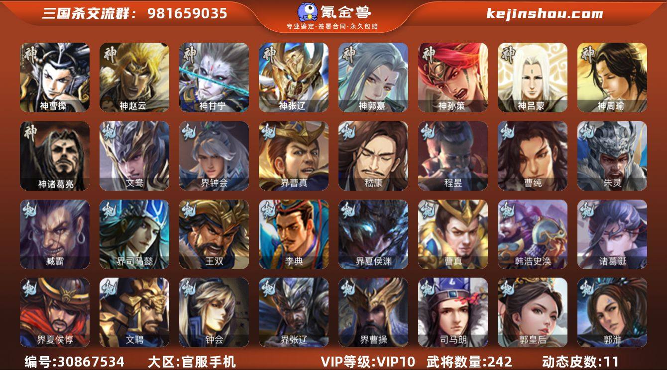 VIP等级: VIP10 官阶: 骠骑将军 武将数量: 242 动态皮肤数量: 11 神将: 神曹操,神甘宁,神郭嘉,神孙策,神张辽,神赵云,神吕蒙,神周瑜,神诸葛亮 魏国武将: 曹纯,程昱,嵇康,界曹真,界钟会,文鸯,唐咨-魏,张辽,SP曹仁,SP关羽,SP贾诩,SP姜维,SP庞德,卞夫人,曹昂,曹操,曹冲,曹洪,曹丕,曹仁,曹叡,王异,鲁芝,曹休,满宠,钟繇,郭嘉,牵招,荀彧,界郭嘉,崔琰,朱灵,界王异,界许褚,华歆,陈群,袁涣,乐进,郭淮,郭皇后,夏侯惇,司马朗,界曹操,许褚,界张辽,谋徐晃,张郃,钟会,文聘,曹彰,界夏侯惇,诸葛诞,司马懿,甄姬,徐晃,韩浩史涣,曹真,典韦,界夏侯渊,夏侯渊,李典,于禁,王双,邓艾,界司马懿,臧霸,朱灵(国战) 蜀国武将: 花鬘,谯周,谋马超,谋夏侯氏,徐庶,吕凯,界关羽,界诸葛亮,邓芝,严颜,界黄月英,赵云,张松,李丰,界刘备,刘封,蒋琬,黄月英,刘巴,关羽,吴懿,界吴懿,祝融,张飞,魏延,界周仓,界法正,刘禅,SP孙尚香,SP徐庶,卧龙诸葛,周仓,界关兴张苞,诸葛亮,界张飞,界马岱,关平,马岱,庞统,诸葛果,谋张飞,马超,廖化,关兴张苞,孟获,夏侯氏,姜维,黄忠,刘备,界马超,李严,马良,甘夫人 吴国武将: 界徐盛,留赞,骆统,文鸯,周泰,吕蒙,诸葛恪,界孙尚香,界顾雍,大乔小乔,桥公,丁奉,谋吕蒙,周鲂,界全琮,顾雍,界朱治,孙休,严畯,界孙权,祖茂,濮阳兴,界吕蒙,孙登,凌操,朱治,孙尚香,程普,大乔,韩当,陆逊,诸葛瑾,太史慈,虞翻,界黄盖,孙鲁班,界周瑜,孙权,鲁肃,界甘宁,吴国太,甘宁,界大乔,孙坚,孙鲁育,凌统,步练师,周瑜,小乔,潘璋马忠,黄盖,孙策,界陆逊,吴-唐咨,徐盛,张昭张纮,陈武蕫袭,朱桓 群国武将: 界李儒,兀突骨,左慈,伏完,刘协,蔡文姬,华雄,刘琦,袁术,高顺,于吉,界公孙瓒,SP貂蝉,吕布,李儒,界貂蝉,公孙瓒,SP赵云,胡车儿,蔡夫人,界张角,SP太史慈,星张郃,潘凤,界袁术,SP马超,朱儁,界华佗,贾诩,庞德,张宝,刘表,董卓,何太后,张角,SP黄月英,曹节,袁绍,华佗,貂蝉,郭图...