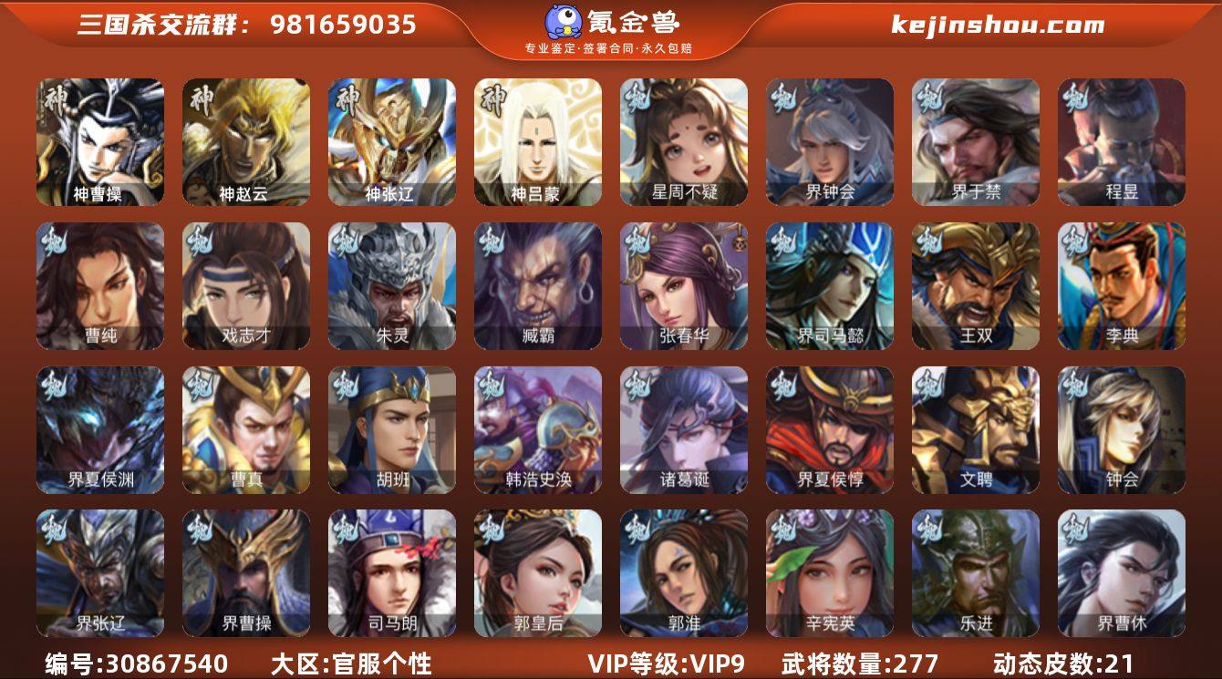 VIP等级: VIP9 官阶: 骠骑将军 武将数量: 277 动态皮肤数量: 21 神将: 神曹操,神张辽,神赵云,神吕蒙 魏国武将: 戏志才,曹纯,程昱,界于禁,界钟会,张辽,SP蔡文姬,SP曹仁,SP关羽,SP贾诩,SP姜维,卞夫人,曹昂,曹操,曹冲,曹洪,曹丕,曹仁,曹叡,王异,张恭,鲁芝,界满宠,界曹植,满宠,荀攸,钟繇,郭嘉,牵招,荀彧,杜畿,界郭嘉,崔琰,界荀彧,朱灵,界王异,界许褚,界郭淮,华歆,陈群,界邓艾,界曹休,乐进,辛宪英,郭淮,郭皇后,夏侯惇,曹植,司马朗,界曹操,星周不疑,许褚,界张辽,钟会,文聘,曹彰,界夏侯惇,诸葛诞,司马懿,甄姬,徐晃,韩浩史涣,胡班,曹真,典韦,界夏侯渊,夏侯渊,李典,于禁,王双,邓艾,界司马懿,张春华,臧霸,朱灵(国战) 蜀国武将: 董允,沙摩柯,诸葛瞻,谋马超,谋赵云,徐庶,界关羽,邓芝,界伊籍,界张嶷,赵云,张松,彭羕,李丰,界刘备,刘封,谋庞统,黄月英,刘巴,关羽,吴懿,吴班,祝融,张飞,黄皓,陈震,魏延,界周仓,马忠,界法正,糜夫人,刘禅,界赵云,谋诸葛亮,张翼,关银屏,SP孙尚香,SP徐庶,卧龙诸葛,周仓,简雍,界关兴张苞,诸葛亮,界张飞,法正,界马岱,关平,马岱,界庞统,庞统,诸葛果,谋张飞,马谡,马超,霍峻,廖化,关兴张苞,孟获,夏侯氏,黄忠,刘备,界马超,李严,马良,傅肜,彭羕(国战) 吴国武将: 界徐盛,留赞,吴景,周处,潘濬,周泰,全琮,吕蒙,诸葛恪,界孙尚香,大乔小乔,谋甘宁,界程普,丁奉,谋吕蒙,周鲂,界全琮,孙茹,顾雍,严畯,界孙权,祖茂,界吕蒙,界孙策,凌操,朱治,孙尚香,程普,大乔,韩当,陆逊,诸葛瑾,朱然,吕范,太史慈,谋大乔,虞翻,界黄盖,孙鲁班,界周瑜,卫温诸葛直,孙权,界孙鲁班,谋小乔,鲁肃,界甘宁,吴国太,甘宁,界大乔,孙坚,孙鲁育,凌统,步练师,周瑜,小乔,潘璋马忠,黄盖,吕岱,孙策,界陆逊,界周泰,谋韩当,徐盛,张昭张纮,陈武蕫袭,朱桓 群国武将: 界左慈,沮授,兀突骨,许攸,左慈,谋陈宫,伏完,刘协,华雄,董白,袁术,高顺,刘繇,界庞德,于吉,界公孙瓒...
