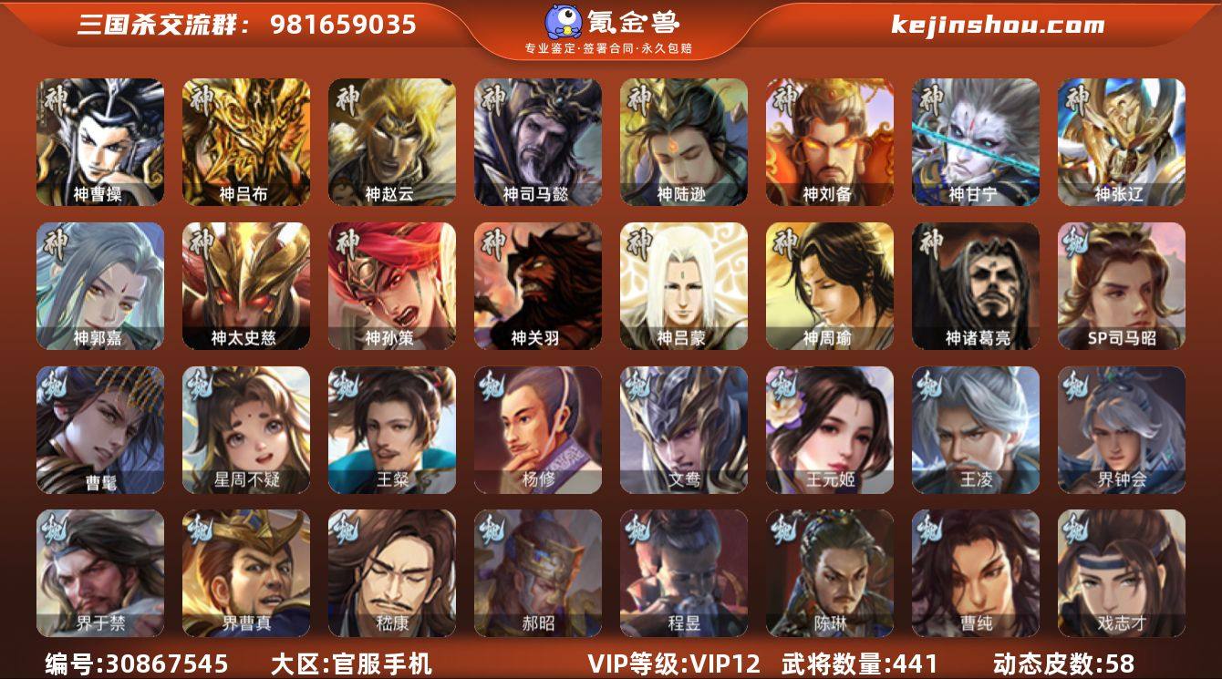VIP等级: VIP12 官阶: 大将军 武将数量: 441 动态皮肤数量: 58 神将: 神曹操,神甘宁,神郭嘉,神刘备,神陆逊,神吕布,神司马懿,神孙策,神太史慈,神张辽,神赵云,神关羽,神吕蒙,神周瑜,神诸葛亮 魏国武将: 刘晔,戏志才,曹纯,陈琳,程昱,郝昭,嵇康,界曹真,界于禁,界钟会,王凌,王元姬,文鸯,杨修,王粲,唐咨-魏,张辽,SP蔡文姬,SP关羽,SP贾诩,SP姜维,SP庞德,卞夫人,蔡贞姬,曹昂,曹操,曹冲,曹洪,曹丕,曹仁,曹叡,王异,张恭,鲁芝,界满宠,曹休,界曹植,满宠,荀攸,王基,钟繇,蒯越蒯良,郭嘉,牵招,荀彧,杜畿,界郭嘉,崔琰,界曹丕,界荀彧,朱灵,界甄姬,吕虔,界陈群,界王异,界许褚,界郭淮,华歆,陈群,界邓艾,界典韦,谋甄姬,司马孚,袁涣,李通,乐进,辛宪英,郭淮,毛玠,郭皇后,毌丘俭,夏侯惇,曹植,司马朗,谋于禁,界曹操,星周不疑,许褚,界张辽,谋徐晃,张郃,钟会,文聘,曹彰,界夏侯惇,诸葛诞,司马懿,甄姬,界徐晃,徐晃,界曹仁,孙资刘放,韩浩史涣,胡班,曹真,典韦,界夏侯渊,夏侯渊,李典,于禁,王双,邓艾,界司马懿,张春华,孟达-魏,臧霸,牛金,朱灵(国战),曹髦,SP司马昭,董昭,谋张辽 蜀国武将: 董允,关索,花鬘,界黄忠,谯周,沙摩柯,王平,张星彩,赵襄,诸葛瞻,谋马超,谋赵云,马云騄,谋黄月英,徐庶,界魏延,杨仪,吕凯,界关羽,界诸葛亮,邓芝,界伊籍,胡金定,费祎,严颜,界黄月英,界张嶷,赵云,张松,彭羕,李丰,界刘备,界刘禅,谋姜维,刘封,糜竺,谋庞统,黄月英,刘巴,关羽,王甫赵累,吴懿,祝融,张飞,黄皓,陈震,魏延,界周仓,马忠,界法正,糜夫人,界孟获,刘禅,界赵云,谋诸葛亮,界姜维,张翼,关银屏,界祝融,SP孙尚香,SP徐庶,卧龙诸葛,宗预,周仓,简雍,谋孟获,界关兴张苞,诸葛亮,孙乾,界张飞,界卧龙诸葛,法正,界简雍,赵统赵广,陈到,界马岱,关平,马岱,界庞统,庞统,诸葛果,谋张飞,马谡,马超,霍峻,廖化,关兴张苞,孟获,夏侯氏,姜维,黄忠,刘备,界马超,李严,马良,傅肜,蒋琬费祎,刘谌,...