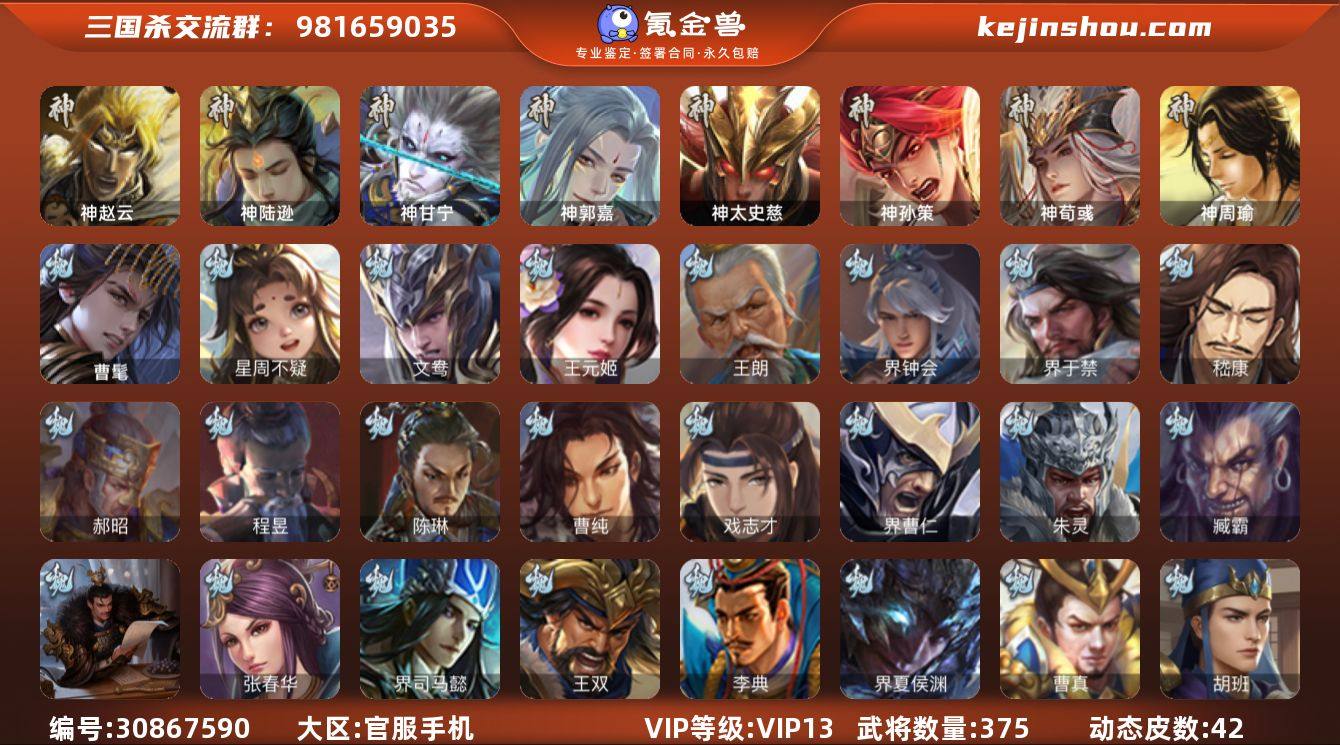 VIP等级: VIP13 官阶: 大将军 武将数量: 375 动态皮肤数量: 42 神将: 神甘宁,神郭嘉,神陆逊,神孙策,神太史慈,神荀彧,神赵云,神周瑜 魏国武将: 戏志才,曹纯,陈琳,程昱,郝昭,嵇康,界于禁,界钟会,王朗,王元姬,文鸯,唐咨-魏,张辽,SP蔡文姬,SP曹仁,SP关羽,SP贾诩,SP姜维,SP庞德,卞夫人,曹昂,曹操,曹冲,曹洪,曹丕,曹仁,曹叡,曹嵩,王异,张恭,鲁芝,界满宠,曹休,界曹植,满宠,荀攸,王基,钟繇,郭嘉,牵招,荀彧,杜畿,界郭嘉,崔琰,界曹丕,界荀彧,朱灵,界甄姬,吕虔,界王异,界许褚,界郭淮,华歆,陈群,界邓艾,界典韦,界曹休,袁涣,李通,乐进,辛宪英,郭淮,界曹彰,郭皇后,毌丘俭,夏侯惇,曹植,司马朗,界曹操,星周不疑,许褚,界张辽,谋徐晃,张郃,钟会,文聘,曹彰,界夏侯惇,诸葛诞,司马懿,甄姬,杨阜,界徐晃,徐晃,界曹仁,孙资刘放,韩浩史涣,胡班,曹真,典韦,界夏侯渊,谋荀彧,夏侯渊,李典,于禁,王双,邓艾,界司马懿,张春华,孟达-魏,臧霸,朱灵(国战),曹髦 蜀国武将: 董允,花鬘,沙摩柯,王平,诸葛瞻,谋马超,谋赵云,徐庶,界魏延,杨仪,界关羽,界诸葛亮,邓芝,界伊籍,严颜,界黄月英,界张嶷,赵云,张松,彭羕,李丰,界刘备,界刘禅,谋姜维,刘封,糜竺,谋庞统,黄月英,刘巴,关羽,王甫赵累,吴懿,界廖化,祝融,张飞,黄皓,魏延,界周仓,马忠,界法正,糜夫人,界孟获,刘禅,界赵云,谋诸葛亮,界姜维,张翼,关银屏,界祝融,SP孙尚香,SP徐庶,卧龙诸葛,宗预,周仓,简雍,界关兴张苞,诸葛亮,界张飞,界卧龙诸葛,法正,赵统赵广,陈到,界马岱,关平,马岱,界庞统,庞统,诸葛果,谋张飞,马谡,马超,廖化,关兴张苞,孟获,秦宓,吴苋,夏侯氏,姜维,黄忠,刘备,界马超,李严,马良,傅肜,蒋琬费祎,刘谌,彭羕(国战),甘夫人 吴国武将: 贺齐,界徐盛,留赞,骆统,孙寒华,周处,文鸯,潘濬,陆绩,周泰,全琮,吕蒙,诸葛恪,界孙尚香,大乔小乔,桥公,谋周瑜,丁奉,谋吕蒙,界全琮,孙茹,薛综,蒋钦,顾雍,阚泽,孙亮,界朱治,...