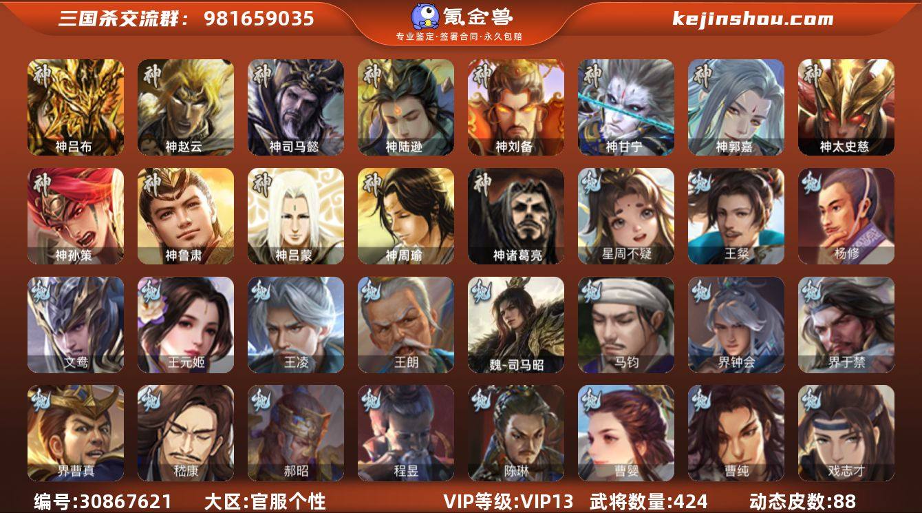 VIP等级: VIP13 官阶: 大将军 武将数量: 424 动态皮肤数量: 88 神将: 神甘宁,神郭嘉,神刘备,神陆逊,神吕布,神司马懿,神孙策,神太史慈,神赵云,神吕蒙,神周瑜,神诸葛亮,神鲁肃 魏国武将: 刘晔,戏志才,曹纯,曹婴,陈琳,程昱,郝昭,嵇康,界曹真,界于禁,界钟会,马钧,魏-司马昭,王朗,王凌,王元姬,文鸯,杨修,王粲,张辽,SP蔡文姬,SP关羽,SP贾诩,SP姜维,SP庞德,卞夫人,蔡贞姬,曹昂,曹操,曹冲,曹洪,曹丕,曹仁,曹叡,贾逵,王异,张恭,鲁芝,界满宠,曹休,界曹植,满宠,荀攸,王基,钟繇,蒯越蒯良,郭嘉,牵招,荀彧,杜畿,界郭嘉,崔琰,界曹丕,界荀彧,朱灵,界甄姬,辛毗,吕虔,界王异,界许褚,界郭淮,华歆,陈群,界邓艾,界典韦,袁涣,李通,乐进,辛宪英,郭淮,毛玠,郭皇后,毌丘俭,夏侯惇,曹植,司马朗,谋于禁,界曹操,星周不疑,许褚,界张辽,谋徐晃,张郃,钟会,文聘,曹彰,界夏侯惇,诸葛诞,司马懿,甄姬,界徐晃,徐晃,界曹仁,孙资刘放,韩浩史涣,胡班,曹真,典韦,界夏侯渊,夏侯渊,李典,于禁,王双,邓艾,界司马懿,张春华,孟达-魏,臧霸,朱灵(国战) 蜀国武将: 鲍三娘,董允,关索,花鬘,谯周,沙摩柯,王平,张星彩,赵襄,周群,诸葛瞻,谋马超,谋赵云,谋夏侯氏,谋黄忠,马云騄,徐庶,界魏延,杨仪,吕凯,界关羽,界诸葛亮,邓芝,界伊籍,费祎,严颜,界黄月英,界张嶷,赵云,张松,彭羕,李丰,界刘备,界刘禅,谋姜维,刘封,糜竺,谋庞统,黄月英,刘巴,关羽,王甫赵累,吴懿,界吴懿,向宠,祝融,张飞,黄皓,魏延,界周仓,马忠,界法正,糜夫人,界孟获,刘禅,界赵云,界姜维,张翼,关银屏,界祝融,SP孙尚香,SP徐庶,卧龙诸葛,宗预,周仓,简雍,界关兴张苞,诸葛亮,孙乾,界张飞,界卧龙诸葛,法正,界简雍,赵统赵广,陈到,界马岱,关平,马岱,界庞统,庞统,诸葛果,谋张飞,马谡,马超,廖化,关兴张苞,谋关羽,孟获,秦宓,吴苋,夏侯氏,姜维,黄忠,刘备,界马超,李严,马良,傅肜,蒋琬费祎,许靖,刘谌,彭羕(国战),甘夫人,蜀-糜芳...