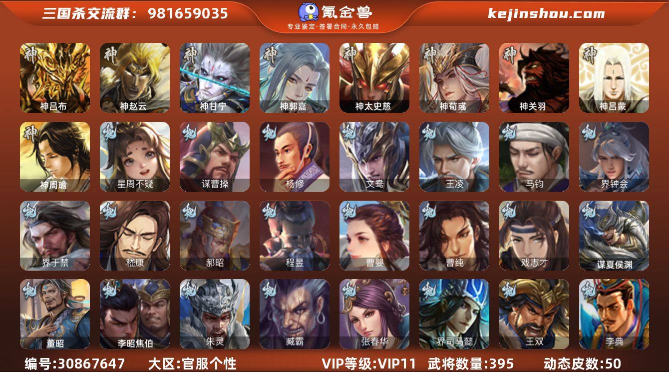 VIP等级: VIP11 官阶: 大将军 武将数量: 395 动态皮肤数量: 50 神将: 神甘宁,神郭嘉,神吕布,神太史慈,神荀彧,神赵云,神关羽,神吕蒙,神周瑜 魏国武将: 戏志才,曹纯,曹婴,程昱,郝昭,嵇康,界于禁,界钟会,马钧,王凌,文鸯,杨修,谋曹操,唐咨-魏,张辽,SP蔡文姬,SP曹仁,SP关羽,SP贾诩,SP姜维,SP庞德,卞夫人,蔡贞姬,曹昂,曹操,曹冲,曹洪,曹丕,曹仁,曹叡,贾逵,王异,张恭,鲁芝,界满宠,曹休,界曹植,满宠,荀攸,王基,钟繇,蒯越蒯良,郭嘉,牵招,荀彧,阮慧,杜畿,界郭嘉,崔琰,界荀彧,朱灵,界甄姬,吕虔,界陈群,界王异,界许褚,界郭淮,华歆,陈群,界曹休,袁涣,李通,乐进,辛宪英,郭淮,毛玠,郭皇后,毌丘俭,夏侯惇,曹植,司马朗,谋于禁,界曹操,星周不疑,许褚,界张辽,谋徐晃,张郃,钟会,文聘,曹彰,界夏侯惇,诸葛诞,司马懿,甄姬,徐晃,孙资刘放,韩浩史涣,胡班,曹真,典韦,夏侯渊,李典,于禁,王双,邓艾,界司马懿,张春华,臧霸,朱灵(国战),李昭焦伯,董昭,谋夏侯渊 蜀国武将: 董允,沙摩柯,王平,赵襄,诸葛瞻,谋马超,谋赵云,马云騄,徐庶,界魏延,吕凯,界关羽,界诸葛亮,邓芝,界伊籍,费祎,严颜,界黄月英,界张嶷,赵云,张松,彭羕,李丰,界刘备,界刘禅,谋姜维,刘封,糜竺,蒋琬,谋庞统,黄月英,刘巴,关羽,王甫赵累,吴懿,吴班,祝融,张飞,黄皓,魏延,界周仓,马忠,界法正,糜夫人,刘禅,界赵云,界姜维,张翼,关银屏,SP孙尚香,SP徐庶,卧龙诸葛,周仓,简雍,界关兴张苞,诸葛亮,孙乾,界张飞,界卧龙诸葛,法正,界简雍,赵统赵广,陈到,界马岱,关平,马岱,界庞统,庞统,诸葛果,谋张飞,马谡,马超,霍峻,廖化,关兴张苞,谋关羽,孟获,秦宓,吴苋,夏侯氏,姜维,黄忠,刘备,界马超,李严,马良,许靖,刘谌,彭羕(国战),甘夫人,SP甘夫人,势陈到 吴国武将: 贺齐,界步练师,界徐盛,界朱然,留赞,骆统,吴景,周处,文鸯,陆绩,周泰,全琮,吕蒙,SP庞统,诸葛恪,界孙尚香,大乔小乔,谋甘宁,桥公,谋周瑜,丁奉,谋吕蒙,...