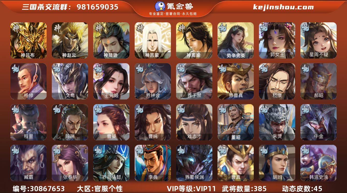 VIP等级: VIP11 官阶: 大将军 武将数量: 385 动态皮肤数量: 45 神将: 神陆逊,神吕布,神赵云,神吕蒙,神周瑜 魏国武将: 戏志才,曹纯,曹婴,陈琳,程昱,郝昭,嵇康,界曹真,界于禁,界钟会,王元姬,文鸯,杨修,唐咨-魏,张辽,SP蔡文姬,SP曹仁,SP关羽,SP贾诩,SP姜维,SP庞德,卞夫人,蔡贞姬,曹昂,曹操,曹冲,曹洪,曹丕,曹仁,曹叡,王异,张恭,鲁芝,界满宠,曹休,界曹植,满宠,荀攸,王基,钟繇,蒯越蒯良,郭嘉,牵招,荀彧,阮慧,杜畿,界郭嘉,崔琰,界曹丕,界荀彧,朱灵,界甄姬,辛毗,吕虔,界陈群,界王异,界许褚,界郭淮,华歆,陈群,界邓艾,界典韦,袁涣,李通,乐进,辛宪英,郭淮,界曹彰,郭皇后,夏侯惇,曹植,司马朗,界曹操,星周不疑,许褚,界张辽,张郃,钟会,文聘,郭女王,曹彰,界夏侯惇,诸葛诞,司马懿,甄姬,界徐晃,徐晃,孙资刘放,韩浩史涣,胡班,曹真,典韦,界夏侯渊,夏侯渊,李典,于禁,邓艾,界司马懿,张春华,臧霸,牛金,朱灵(国战),董昭,势辛宪英 蜀国武将: 董允,花鬘,界黄忠,谯周,沙摩柯,王平,张星彩,赵襄,诸葛瞻,谋马超,谋赵云,徐庶,界魏延,杨仪,吕凯,界关羽,界诸葛亮,邓芝,界伊籍,费祎,严颜,界黄月英,界张嶷,赵云,张松,彭羕,李丰,界刘备,界刘禅,谋姜维,刘封,糜竺,谋庞统,黄月英,关羽,吴懿,吴班,向宠,祝融,张飞,黄皓,陈震,魏延,界周仓,马忠,界法正,糜夫人,界孟获,刘禅,界赵云,界姜维,关银屏,界祝融,SP孙尚香,SP徐庶,卧龙诸葛,周仓,简雍,界关兴张苞,诸葛亮,孙乾,界张飞,界卧龙诸葛,法正,界简雍,赵统赵广,界马岱,关平,马岱,界庞统,庞统,诸葛果,马谡,马超,廖化,关兴张苞,孟获,秦宓,吴苋,夏侯氏,姜维,黄忠,刘备,界马超,李严,马良,蒋琬费祎,刘谌,彭羕(国战),甘夫人,SP甘夫人,势陈祗 吴国武将: 界徐盛,界朱然,留赞,骆统,吴景,文鸯,潘濬,张温,周泰,全琮,吕蒙,诸葛恪,界孙尚香,大乔小乔,桥公,谋周瑜,界程普,丁奉,谋吕蒙,孙茹,薛综,蒋钦,顾雍,孙亮,界朱治,孙休,...