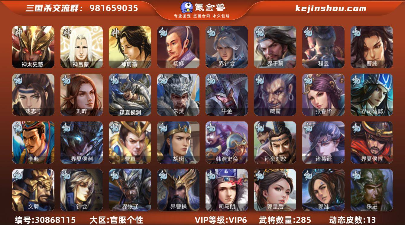 VIP等级: VIP6 官阶: 骠骑将军 武将数量: 285 动态皮肤数量: 13 神将: 神太史慈,神吕蒙,神周瑜 魏国武将: 刘晔,戏志才,曹纯,程昱,界于禁,界钟会,杨修,唐咨-魏,张辽,SP蔡文姬,SP曹仁,SP关羽,SP贾诩,SP姜维,卞夫人,曹昂,曹操,曹冲,曹洪,曹丕,曹仁,曹叡,王异,界满宠,界曹植,满宠,荀攸,钟繇,郭嘉,荀彧,阮慧,杜畿,界郭嘉,崔琰,界荀彧,朱灵,界甄姬,吕虔,界王异,界许褚,陈群,界曹休,李通,乐进,郭淮,郭皇后,夏侯惇,曹植,司马朗,谋于禁,界曹操,许褚,界张辽,谋徐晃,张郃,钟会,文聘,曹彰,界夏侯惇,诸葛诞,司马懿,甄姬,徐晃,孙资刘放,韩浩史涣,胡班,曹真,典韦,界夏侯渊,夏侯渊,李典,于禁,邓艾,界司马懿,张春华,臧霸,牛金,朱灵(国战),谋夏侯渊 蜀国武将: 董允,花鬘,界黄忠,谯周,沙摩柯,谋赵云,徐庶,杨仪,吕凯,界关羽,界诸葛亮,邓芝,界伊籍,费祎,界黄月英,界张嶷,赵云,张松,彭羕,李丰,界刘备,刘封,糜竺,谋庞统,黄月英,关羽,王甫赵累,吴懿,吴班,祝融,张飞,黄皓,魏延,界周仓,马忠,界法正,刘禅,界姜维,关银屏,SP孙尚香,SP徐庶,卧龙诸葛,周仓,简雍,界关兴张苞,诸葛亮,界张飞,法正,陈到,界马岱,关平,马岱,庞统,诸葛果,马谡,马超,霍峻,廖化,关兴张苞,孟获,夏侯氏,姜维,黄忠,刘备,界马超,马良,蒋琬费祎,彭羕(国战),甘夫人,蜀-糜芳傅士仁 吴国武将: 贺齐,界徐盛,潘濬,周泰,全琮,吕蒙,诸葛恪,许贡,丁奉,谋吕蒙,蒋钦,顾雍,阚泽,界朱治,界孙权,孙翊,界孙休,祖茂,濮阳兴,界吕蒙,孙登,界孙策,凌操,朱治,孙尚香,程普,大乔,韩当,陆逊,诸葛瑾,朱然,吕范,太史慈,周妃,虞翻,界黄盖,孙鲁班,界周瑜,界潘璋马忠,孙权,界孙鲁班,界小乔,鲁肃,界甘宁,吴国太,甘宁,界大乔,孙坚,孙鲁育,凌统,步练师,周瑜,小乔,潘璋马忠,黄盖,孙策,界陆逊,界吴国太,吴-唐咨,谋韩当,徐盛,张昭张纮,陈武蕫袭,吴-糜芳傅士仁,朱桓 群国武将: 界李儒,麹义,苏飞,兀突骨,张让,左慈,...