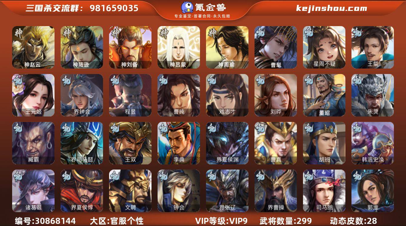 官阶:骠骑将军;VIP等级:VIP8;史诗武将数量:15;动态皮肤数量:7;武将总数:252;史诗宝珠数量:40;将魂数量:2027;神将:3;魏国史诗武将:2;蜀国史诗武将:2;吴国史诗武将:3;群史诗武将:4 神赵云,神郭嘉,神诸葛亮,界钟会,界于禁,曹纯,程昱,诸葛瞻,沙摩柯,骆统,留赞,界徐盛,苏飞,沮授,许攸,兀突骨,神周瑜,SP关羽,SP蔡文姬,乐进,曹昂,诸葛诞,朱灵,文聘,SP姜维,张春华,钟会,曹冲,郭淮,满宠,界王异,界曹操,界司马懿,界夏侯惇,界张辽,界许褚,界郭嘉,李典,曹真,韩浩史涣,陈群,钟繇,司马朗,郭皇后,吕虔,鲁芝,蒯越蒯良,界荀彧,界徐晃,界邓艾,界曹植,界满宠,卞夫人,华歆,王双,崔琰,杨阜,界曹仁,臧霸,SP孙尚香,关银屏,夏侯霸,马良,关兴张苞,廖化,界马岱,关平,简雍,刘封,界法正,界关兴张苞,界刘备,界关羽,界张飞,界赵云,界马超,SP徐庶,吴懿,周仓,张松,刘谌,夏侯氏,李严,吴苋,秦宓,界黄月英,赵统赵广,糜夫人,界周仓,彭羕,谋庞统,诸葛果,界魏延,蒋琬费祎,糜芳傅士仁,甘夫人,鲁肃,孙茹,凌操,大乔小乔,诸葛恪,诸葛瑾,孙鲁育,程普,韩当,潘璋马忠,虞翻,朱然,界甘宁,界吕蒙,界黄盖,界周瑜,界大乔,界陆逊,孙鲁班,朱桓,顾雍,朱治,徐氏,薛综,界孙权,界孙尚香,潘濬,孙亮,严畯,界孙策,界吴国太,界凌统,蒋钦,谋吕蒙,界全琮,界朱治,谋小乔,伏完,刘协,界袁术,SP赵云,张宝,伏皇后,李儒,华雄,袁术,界华佗,界吕布,公孙瓒,蔡夫人,公孙渊,郭图逢纪,张鲁,严白虎,董白,刘虞,蔡邕,界貂蝉,卢植,刘琦,界庞德,界颜良文丑,界袁绍,刘繇,张绣,界蔡文姬,界高顺,界刘表,星张辽,星徐晃,星张郃,界公孙瓒,胡车儿,界伏皇后,孔融,朱儁,谋刘赪,神赵云-战龙在野(动态),神郭嘉-虎年清明(动态),SP蔡文姬-兔年冬日(动态),孙策-虎踞江东(动态),徐盛-破军杀将(动态),周处-义除三害(动态),刘协-龙困于渊(动态),灵雎-霜刃绚练(动态)
