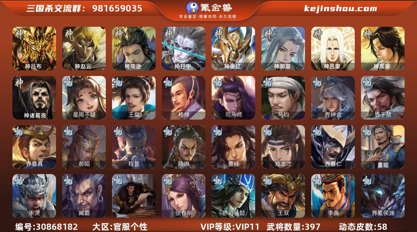 VIP等级: VIP11 官阶: 大将军 武将数量: 397 动态皮肤数量: 58 神将: 神甘宁,神郭嘉,神陆逊,神吕布,神张辽,神赵云,神吕蒙,神周瑜,神诸葛亮 魏国武将: 戏志才,曹纯,陈琳,程昱,郝昭,界曹真,界于禁,界钟会,马钧,司马师,杨修,王粲,唐咨-魏,张辽,SP蔡文姬,SP曹仁,SP关羽,SP贾诩,SP姜维,SP庞德,卞夫人,蔡贞姬,曹昂,曹操,曹冲,曹洪,曹丕,曹仁,曹叡,王异,鲁芝,界满宠,曹休,界曹植,满宠,荀攸,王基,钟繇,蒯越蒯良,郭嘉,牵招,荀彧,阮慧,杜畿,界郭嘉,崔琰,界曹丕,界荀彧,朱灵,界甄姬,吕虔,界陈群,界王异,界许褚,华歆,陈群,界邓艾,界典韦,袁涣,李通,乐进,辛宪英,郭淮,毛玠,界曹彰,郭皇后,毌丘俭,夏侯惇,曹植,司马朗,谋于禁,界曹操,星周不疑,许褚,界张辽,谋徐晃,张郃,钟会,文聘,曹彰,界夏侯惇,诸葛诞,司马懿,甄姬,界徐晃,徐晃,界曹仁,孙资刘放,韩浩史涣,曹真,典韦,界夏侯渊,谋荀彧,夏侯渊,李典,于禁,王双,邓艾,界司马懿,张春华,孟达-魏,臧霸,朱灵(国战),董昭 蜀国武将: 关索,花鬘,界黄忠,谯周,王平,张星彩,赵襄,周群,诸葛瞻,谋马超,谋赵云,马云騄,徐庶,界魏延,杨仪,界关羽,界诸葛亮,邓芝,界伊籍,费祎,严颜,界黄月英,界张嶷,赵云,张松,彭羕,李丰,界刘备,界刘禅,刘封,糜竺,蒋琬,谋庞统,黄月英,刘巴,关羽,吴懿,界吴懿,界廖化,祝融,张飞,黄皓,陈震,魏延,界周仓,马忠,界法正,糜夫人,刘禅,界赵云,界姜维,张翼,关银屏,SP孙尚香,SP徐庶,卧龙诸葛,周仓,简雍,界关兴张苞,诸葛亮,孙乾,界张飞,界卧龙诸葛,法正,界简雍,赵统赵广,陈到,界马岱,关平,马岱,界庞统,庞统,诸葛果,谋张飞,马谡,马超,廖化,关兴张苞,孟获,秦宓,吴苋,夏侯氏,姜维,黄忠,刘备,界马超,李严,马良,蒋琬费祎,许靖,刘谌,彭羕(国战),甘夫人 吴国武将: 贺齐,界徐盛,界朱然,留赞,骆统,吴景,周处,潘濬,周泰,全琮,吕蒙,SP庞统,诸葛恪,界孙尚香,界顾雍,大乔小乔,桥公,谋周瑜,界程普,许...