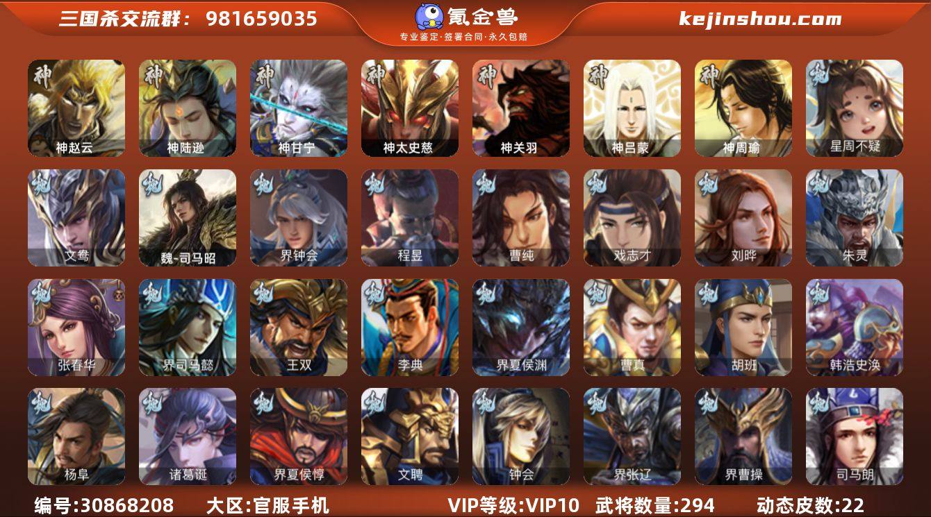 VIP等级: VIP10 官阶: 骠骑将军 武将数量: 294 动态皮肤数量: 22 神将: 神甘宁,神陆逊,神太史慈,神赵云,神关羽,神吕蒙,神周瑜 魏国武将: 刘晔,戏志才,曹纯,程昱,界钟会,魏-司马昭,文鸯,唐咨-魏,张辽,SP蔡文姬,SP关羽,SP贾诩,SP姜维,SP庞德,卞夫人,曹昂,曹操,曹冲,曹丕,曹仁,曹叡,张恭,鲁芝,界满宠,界曹植,满宠,荀攸,王基,钟繇,郭嘉,牵招,荀彧,杜畿,界郭嘉,崔琰,界荀彧,朱灵,吕虔,界王异,界许褚,界郭淮,华歆,陈群,界邓艾,界曹休,李通,乐进,辛宪英,郭淮,毛玠,郭皇后,夏侯惇,曹植,司马朗,谋于禁,界曹操,星周不疑,许褚,界张辽,谋徐晃,张郃,钟会,文聘,曹彰,界夏侯惇,诸葛诞,司马懿,甄姬,杨阜,徐晃,韩浩史涣,胡班,曹真,典韦,界夏侯渊,夏侯渊,李典,于禁,王双,邓艾,界司马懿,张春华,朱灵(国战) 蜀国武将: 谯周,沙摩柯,谋马超,谋赵云,马云騄,徐庶,界魏延,杨仪,界关羽,界诸葛亮,严颜,界黄月英,界张嶷,赵云,张松,彭羕,界刘备,刘封,糜竺,黄月英,刘巴,关羽,吴懿,吴班,祝融,张飞,黄皓,魏延,界周仓,马忠,界法正,糜夫人,刘禅,界赵云,张翼,关银屏,SP孙尚香,SP徐庶,卧龙诸葛,宗预,周仓,界关兴张苞,诸葛亮,界张飞,法正,界马岱,关平,马岱,界庞统,庞统,诸葛果,谋张飞,马谡,马超,廖化,关兴张苞,孟获,秦宓,吴苋,夏侯氏,姜维,黄忠,刘备,界马超,李严,马良,蒋琬费祎,刘谌,彭羕(国战),甘夫人,蜀-糜芳傅士仁 吴国武将: 界徐盛,界朱然,留赞,骆统,孙寒华,文鸯,潘濬,张温,周泰,吕蒙,诸葛恪,界孙尚香,界顾雍,桥公,许贡,丁奉,谋吕蒙,界全琮,孙茹,薛综,顾雍,孙亮,界朱治,孙休,严畯,界孙权,孙翊,界孙休,祖茂,孙登,凌操,朱治,徐氏,孙尚香,程普,大乔,韩当,陆逊,诸葛瑾,朱然,吕范,太史慈,虞翻,界黄盖,孙鲁班,界周瑜,孙权,界孙鲁班,谋小乔,鲁肃,界甘宁,甘宁,界大乔,孙坚,孙鲁育,凌统,步练师,周瑜,小乔,潘璋马忠,黄盖,吕岱,界陆逊,吴-唐咨,徐盛,张昭张纮,吴...