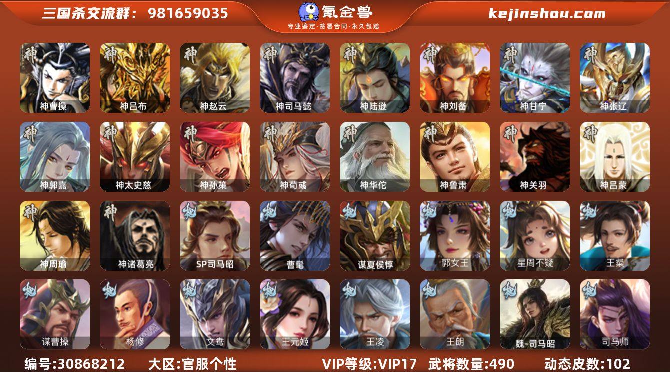VIP等级: VIP17 官阶: 大将军 武将数量: 490 动态皮肤数量: 102 神将: 神曹操,神甘宁,神郭嘉,神刘备,神陆逊,神吕布,神司马懿,神孙策,神太史慈,神荀彧,神张辽,神赵云,神关羽,神吕蒙,神周瑜,神诸葛亮,神鲁肃,神华佗 魏国武将: 刘晔,戏志才,曹纯,曹婴,陈琳,程昱,郝昭,嵇康,界曹真,界于禁,界钟会,司马师,魏-司马昭,王朗,王凌,王元姬,文鸯,杨修,谋曹操,王粲,唐咨-魏,张辽,SP蔡文姬,SP曹仁,SP关羽,SP贾诩,SP姜维,SP庞德,卞夫人,蔡贞姬,曹昂,曹操,曹冲,曹洪,曹丕,曹仁,曹叡,曹嵩,贾逵,王异,张恭,鲁芝,界满宠,曹休,界曹植,满宠,荀攸,王基,钟繇,蒯越蒯良,郭嘉,牵招,荀彧,阮慧,杜畿,界郭嘉,崔琰,界曹丕,界荀彧,朱灵,界甄姬,吕虔,界王异,界许褚,界郭淮,华歆,陈群,界邓艾,界典韦,界曹休,谋甄姬,袁涣,李通,乐进,辛宪英,谋曹仁,郭淮,毛玠,界曹彰,郭皇后,毌丘俭,夏侯惇,曹植,司马朗,谋于禁,界曹操,星周不疑,许褚,界张辽,谋徐晃,张郃,钟会,文聘,郭女王,曹彰,界夏侯惇,诸葛诞,司马懿,甄姬,杨阜,界徐晃,徐晃,界曹仁,孙资刘放,韩浩史涣,胡班,曹真,典韦,界夏侯渊,夏侯渊,李典,于禁,王双,邓艾,界司马懿,张春华,孟达-魏,臧霸,牛金,朱灵(国战),谋夏侯惇,曹髦,李昭焦伯,SP司马昭,司马伷,董昭 蜀国武将: 董允,关索,花鬘,界黄忠,谯周,沙摩柯,王平,张星彩,赵襄,周群,诸葛瞻,谋马超,谋赵云,谋夏侯氏,谋黄忠,马云騄,徐庶,界魏延,杨仪,谋刘备,吕凯,界关羽,界诸葛亮,邓芝,界伊籍,胡金定,费祎,严颜,界黄月英,界张嶷,赵云,张松,彭羕,李丰,界刘备,谋法正,界刘禅,谋姜维,刘封,糜竺,李遗,谋庞统,黄月英,刘巴,关羽,王甫赵累,吴懿,吴班,界吴懿,界廖化,向宠,祝融,张飞,黄皓,陈震,魏延,界周仓,谋祝融,马忠,界法正,糜夫人,界孟获,刘禅,界赵云,谋诸葛亮,界姜维,张翼,关银屏,界祝融,SP孙尚香,SP徐庶,卧龙诸葛,宗预,周仓,简雍,谋孟获,界关兴张苞,诸葛亮,孙乾,界...