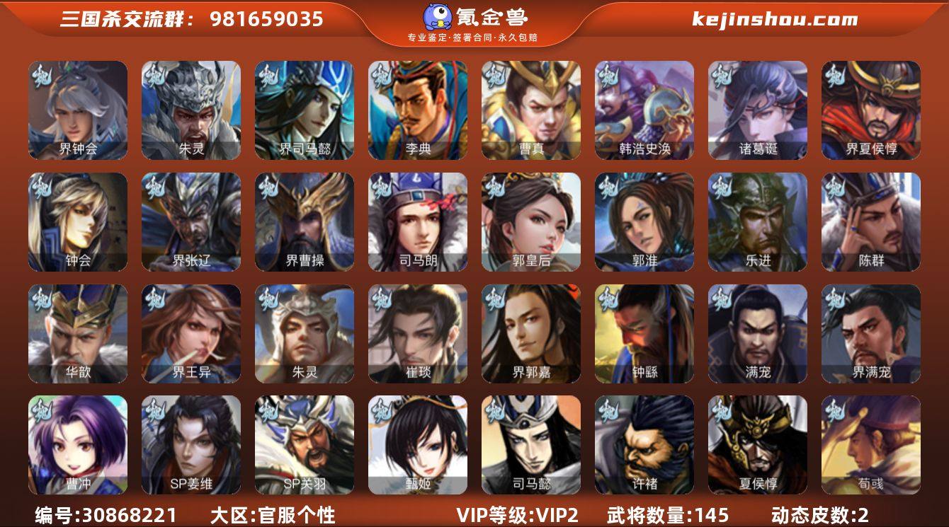 VIP等级: VIP2 官阶: 先锋将军 武将数量: 145 动态皮肤数量: 2 魏国武将: 界钟会,张辽,SP关羽,SP姜维,SP庞德,曹操,曹冲,曹丕,曹仁,界满宠,满宠,钟繇,郭嘉,荀彧,界郭嘉,崔琰,朱灵,界王异,华歆,陈群,乐进,郭淮,郭皇后,夏侯惇,司马朗,界曹操,许褚,界张辽,钟会,曹彰,界夏侯惇,诸葛诞,司马懿,甄姬,韩浩史涣,曹真,典韦,夏侯渊,李典,于禁,邓艾,界司马懿,朱灵(国战) 蜀国武将: 杨仪,界张嶷,赵云,张松,彭羕,李丰,界刘备,刘封,黄月英,关羽,吴懿,吴班,张飞,黄皓,魏延,界法正,刘禅,SP徐庶,卧龙诸葛,周仓,界关兴张苞,诸葛亮,法正,界马岱,关平,庞统,马超,廖化,关兴张苞,孟获,黄忠,刘备,界马超,马良,彭羕(国战),蜀-糜芳傅士仁 吴国武将: 周泰,吕蒙,诸葛恪,顾雍,界朱治,孙尚香,程普,大乔,韩当,陆逊,诸葛瑾,太史慈,虞翻,孙鲁班,界周瑜,孙权,界甘宁,吴国太,甘宁,界大乔,孙坚,孙鲁育,周瑜,小乔,潘璋马忠,黄盖,孙策,界陆逊,谋韩当,张昭张纮,陈武蕫袭,吴-糜芳傅士仁,势太史慈 群国武将: 公孙康,庞德公,麹义,左慈,伏完,华雄,董白,刘琦,袁术,高顺,于吉,吕布,李儒,公孙瓒,界袁术,界华佗,贾诩,庞德,张宝,董卓,何太后,张角,SP黄月英,袁绍,华佗,貂蝉,界吕布,公孙渊,颜良文丑,李傕郭汜,邹氏,马腾,纪灵,友庞统