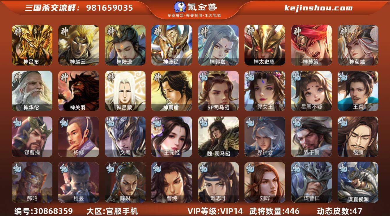 VIP等级: VIP14 官阶: 大将军 武将数量: 446 动态皮肤数量: 47 神将: 神郭嘉,神陆逊,神吕布,神孙策,神太史慈,神荀彧,神张辽,神赵云,神关羽,神吕蒙,神周瑜,神华佗 魏国武将: 刘晔,戏志才,曹纯,陈琳,程昱,郝昭,嵇康,界于禁,界钟会,魏-司马昭,王元姬,文鸯,杨修,谋曹操,王粲,唐咨-魏,徐庶,张辽,SP蔡文姬,SP曹仁,SP关羽,SP贾诩,SP姜维,SP庞德,卞夫人,蔡贞姬,曹昂,曹操,曹冲,曹洪,曹丕,曹仁,曹叡,曹嵩,贾逵,王异,张恭,鲁芝,界满宠,曹休,界曹植,满宠,荀攸,王基,钟繇,蒯越蒯良,郭嘉,牵招,荀彧,阮慧,杜畿,界郭嘉,崔琰,界曹丕,界荀彧,朱灵,界甄姬,吕虔,界王异,界许褚,界郭淮,华歆,陈群,界邓艾,界典韦,界曹休,袁涣,李通,乐进,辛宪英,谋曹仁,郭淮,郭皇后,毌丘俭,夏侯惇,曹植,司马朗,谋于禁,界曹操,星周不疑,许褚,界张辽,谋徐晃,张郃,钟会,文聘,郭女王,曹彰,界夏侯惇,诸葛诞,司马懿,甄姬,杨阜,界徐晃,徐晃,孙资刘放,韩浩史涣,胡班,曹真,典韦,界夏侯渊,夏侯渊,李典,于禁,王双,邓艾,界司马懿,张春华,孟达-魏,臧霸,牛金,朱灵(国战),SP司马昭,董昭,谋夏侯渊 蜀国武将: 关索,花鬘,界黄忠,傅佥,谯周,沙摩柯,王平,赵襄,谋赵云,谋夏侯氏,谋黄忠,马云騄,谋黄月英,徐庶,界魏延,杨仪,谋刘备,吕凯,界关羽,界诸葛亮,邓芝,界伊籍,胡金定,费祎,严颜,界黄月英,界张嶷,赵云,张松,彭羕,李丰,界刘备,谋法正,界刘禅,谋姜维,刘封,糜竺,李遗,谋庞统,黄月英,刘巴,关羽,王甫赵累,吴懿,吴班,界吴懿,向宠,祝融,张飞,黄皓,陈震,魏延,界周仓,马忠,界法正,糜夫人,界孟获,刘禅,界赵云,谋诸葛亮,界姜维,张翼,关银屏,界祝融,SP孙尚香,SP徐庶,卧龙诸葛,宗预,周仓,简雍,界关兴张苞,诸葛亮,孙乾,界张飞,界卧龙诸葛,法正,赵统赵广,陈到,界马岱,关平,马岱,界庞统,庞统,诸葛果,谋张飞,马谡,马超,霍峻,廖化,关兴张苞,孟获,秦宓,吴苋,夏侯氏,姜维,黄忠,刘备,界马超,李严,...