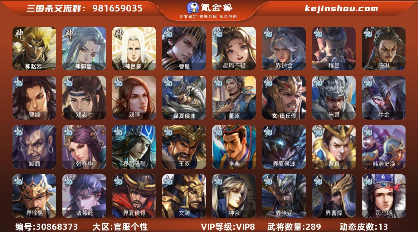 VIP等级: VIP8 官阶: 骠骑将军 武将数量: 289 动态皮肤数量: 13 神将: 神郭嘉,神赵云,神吕蒙 魏国武将: 刘晔,戏志才,曹纯,陈琳,程昱,界钟会,徐庶,张辽,SP蔡文姬,SP关羽,SP贾诩,SP姜维,卞夫人,曹昂,曹操,曹冲,曹洪,曹丕,曹仁,曹叡,曹嵩,王异,鲁芝,界满宠,曹休,界曹植,满宠,荀攸,王基,钟繇,郭嘉,牵招,荀彧,杜畿,界郭嘉,崔琰,界曹丕,界荀彧,朱灵,界王异,界许褚,界郭淮,华歆,陈群,谋甄姬,袁涣,乐进,辛宪英,郭淮,毛玠,界曹彰,郭皇后,夏侯惇,曹植,司马朗,界曹操,星周不疑,许褚,界张辽,谋徐晃,张郃,钟会,文聘,曹彰,界夏侯惇,诸葛诞,司马懿,甄姬,界徐晃,徐晃,韩浩史涣,曹真,典韦,界夏侯渊,夏侯渊,李典,于禁,王双,邓艾,界司马懿,张春华,臧霸,牛金,朱灵(国战),曹髦,玄·毌丘俭,董昭,谋夏侯渊 蜀国武将: 界黄忠,谯周,沙摩柯,赵襄,谋马超,徐庶,界关羽,界诸葛亮,邓芝,界伊籍,费祎,严颜,界黄月英,赵云,张松,彭羕,李丰,界刘备,谋姜维,刘封,黄月英,关羽,吴懿,吴班,祝融,张飞,魏延,谋祝融,马忠,界法正,刘禅,界赵云,关银屏,SP孙尚香,SP徐庶,卧龙诸葛,周仓,简雍,界关兴张苞,诸葛亮,界张飞,法正,陈到,界马岱,关平,马岱,庞统,诸葛果,谋张飞,马谡,马超,来敏,廖化,关兴张苞,孟获,夏侯氏,姜维,黄忠,刘备,界马超,李严,马良,傅肜,蒋琬费祎,刘谌,彭羕(国战),甘夫人 吴国武将: 界步练师,潘濬,周泰,全琮,吕蒙,诸葛恪,界孙尚香,大乔小乔,桥公,丁奉,谋吕蒙,界全琮,孙茹,顾雍,界朱治,孙休,严畯,界孙权,界凌统,祖茂,濮阳兴,界吕蒙,凌操,朱治,孙尚香,程普,大乔,韩当,陆逊,诸葛瑾,朱然,吕范,太史慈,虞翻,界黄盖,孙鲁班,界周瑜,界潘璋马忠,卫温诸葛直,孙权,界孙鲁班,谋小乔,界小乔,鲁肃,界甘宁,吴国太,甘宁,界大乔,孙坚,孙鲁育,凌统,步练师,周瑜,小乔,潘璋马忠,黄盖,孙策,界陆逊,界吴国太,徐盛,张昭张纮,界张昭张纮,朱桓 群国武将: 界李儒,麹义,兀突骨,...