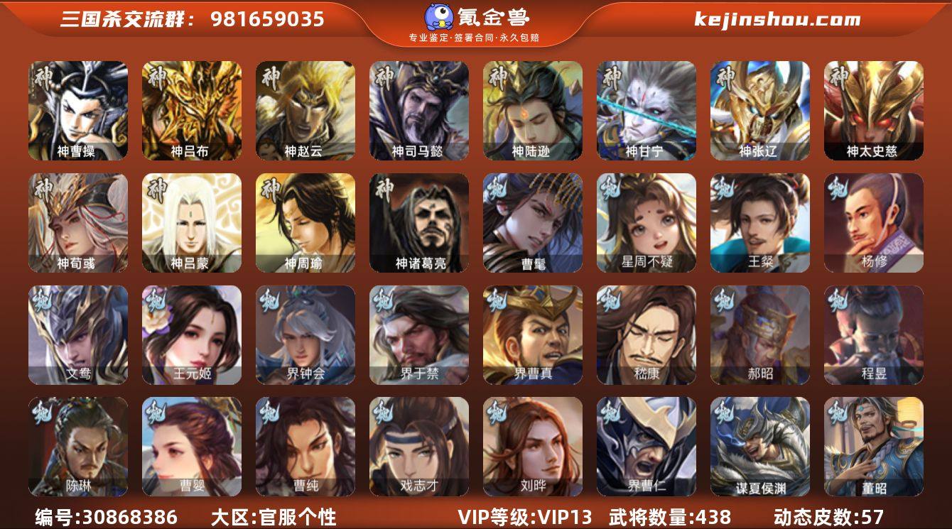 【2960】官阶:大将军;VIP等级:VIP13;史诗武将数量:71;动态皮肤数量:69;武将总数:454;史诗宝珠数量:8;将魂数量:6150;神将:10;魏国史诗武将:40;蜀国史诗武将:12;吴国史诗武将:9;群史诗武将:25 神吕布,神赵云,神司马懿,神陆逊,神刘备,神甘宁,神张辽,神郭嘉,神荀彧,神诸葛亮,星周不疑,谋曹仁,王粲,杨修,王元姬,界钟会,界于禁,界曹真,嵇康,郝昭,陈琳,曹婴,曹纯,戏志才,谋曹丕,势董昭,清河公主,程昱,谋诸葛亮,马云騄,谋赵云,诸葛瞻,赵襄,张星彩,王平,沙摩柯,谯周,界黄忠,花鬘,谋关羽,张奋,周处,骆统,留赞,界徐盛,贺齐,势太史慈,文鸯,谋公孙瓒,十常侍,裴秀,界沮授,左慈,张让,张琪瑛,星黄忠,审配,麹义,庞德公,祢衡,刘焉,沮授,界左慈,界李儒,杜预,卑弥呼,谋张角,许攸,势于吉,星董卓,兀突骨,司马昭,神吕蒙,神周瑜,神关羽,势夏侯尚,SP关羽,SP蔡文姬,乐进,曹昂,诸葛诞,朱灵,文聘,SP姜维,张春华,钟会,曹冲,郭淮,满宠,界王异,界曹操,界司马懿,界夏侯惇,界张辽,界许褚,界郭嘉,李典,曹真,韩浩史涣,陈群,曹叡,曹休,钟繇,司马朗,王基,李通,郭皇后,孙资刘放,辛宪英,界甄姬,吕虔,鲁芝,蒯越蒯良,界典韦,界荀彧,界徐晃,杜畿,界曹丕,毌丘俭,界邓艾,张恭,贾逵,界曹植,界满宠,界郭淮,卞夫人,辛毗,界陈群,华歆,蔡贞姬,王双,崔琰,毛玠,杨阜,曹嵩,谋徐晃,谋甄姬,谋荀彧,界曹休,牵招,胡班,成济,玄毌丘俭,司马孚,王经,谋张辽,牛金,界夏侯渊,界曹仁,臧霸,董昭,SP孙尚香,关银屏,夏侯霸,马良,关兴张苞,廖化,界马岱,关平,简雍,刘封,界法正,界关兴张苞,界刘备,界关羽,界张飞,界赵云,界马超,SP徐庶,吴懿,周仓,张松,刘谌,夏侯氏,糜竺,马忠,孙乾,李严,黄皓,界黄月英,界诸葛亮,赵统赵广,严颜,界伊籍,界卧龙诸葛,界庞统,界孟获,界祝融,陈到,界姜维,界刘禅,胡金定,张翼,杨仪,界廖化,邓芝,傅肜,陈震,糜夫人,王甫赵累,界周仓,宗预,刘巴,界吴懿,谋法...