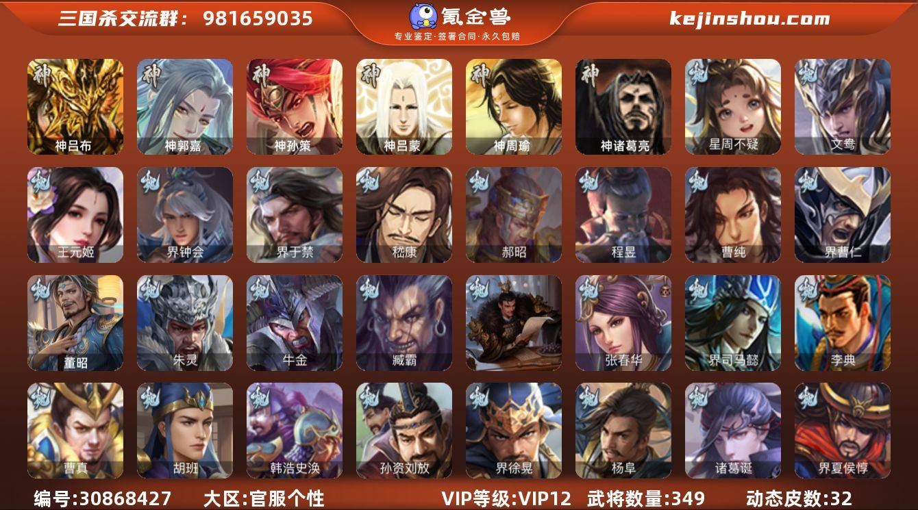 VIP等级: VIP12 官阶: 大将军 武将数量: 422 动态皮肤数量: 39 神将: 神甘宁,神郭嘉,神陆逊,神吕布,神孙策,神太史慈,神荀彧,神张辽,神赵云,神吕蒙,神周瑜,神华佗 魏国武将: 刘晔,戏志才,曹纯,曹婴,陈琳,程昱,郝昭,嵇康,界曹真,界于禁,界钟会,王元姬,文鸯,杨修,王粲,徐庶,张辽,SP蔡文姬,SP曹仁,SP关羽,SP贾诩,SP姜维,SP庞德,卞夫人,蔡贞姬,曹昂,曹操,曹冲,曹洪,曹丕,曹仁,曹叡,王异,张恭,鲁芝,界满宠,曹休,界曹植,满宠,荀攸,王基,钟繇,蒯越蒯良,郭嘉,牵招,荀彧,杜畿,界郭嘉,崔琰,界曹丕,界荀彧,朱灵,界甄姬,吕虔,界王异,界许褚,界郭淮,华歆,陈群,界邓艾,界典韦,界曹休,司马孚,袁涣,李通,乐进,辛宪英,郭淮,毛玠,界曹彰,郭皇后,夏侯惇,曹植,司马朗,谋于禁,界曹操,许褚,界张辽,谋徐晃,张郃,钟会,文聘,曹彰,界夏侯惇,诸葛诞,司马懿,甄姬,界徐晃,徐晃,界曹仁,孙资刘放,韩浩史涣,胡班,曹真,典韦,界夏侯渊,夏侯渊,李典,于禁,王双,邓艾,界司马懿,张春华,孟达-魏,臧霸,朱灵(国战),曹髦,玄·毌丘俭,清河公主,谋郭嘉,谋夏侯渊,势国渊 蜀国武将: 董允,关索,花鬘,界黄忠,谯周,沙摩柯,赵襄,诸葛瞻,谋马超,谋赵云,谋黄忠,马云騄,徐庶,界魏延,杨仪,吕凯,界关羽,界诸葛亮,邓芝,界伊籍,费祎,严颜,界黄月英,界张嶷,赵云,张松,彭羕,李丰,界刘备,谋姜维,刘封,糜竺,谋庞统,黄月英,关羽,王甫赵累,吴懿,向宠,祝融,张飞,黄皓,陈震,魏延,界周仓,谋祝融,马忠,界法正,糜夫人,界孟获,刘禅,界赵云,谋诸葛亮,界姜维,张翼,关银屏,界祝融,SP孙尚香,SP徐庶,卧龙诸葛,宗预,周仓,简雍,谋孟获,界关兴张苞,诸葛亮,孙乾,界张飞,界卧龙诸葛,法正,陈到,界马岱,关平,马岱,界庞统,庞统,诸葛果,谋张飞,马谡,马超,霍峻,廖化,关兴张苞,谋关羽,孟获,夏侯氏,姜维,黄忠,刘备,界马超,李严,马良,傅肜,蒋琬费祎,许靖,刘谌,蜀-孟达,彭羕(国战),甘夫人,SP甘夫人,势陈到 吴国...