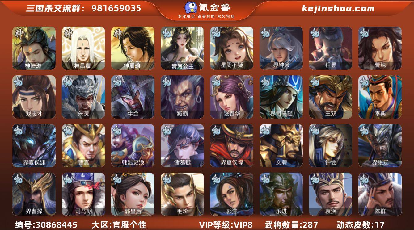 VIP等级: VIP8 官阶: 骠骑将军 武将数量: 287 动态皮肤数量: 17 25宝珠 神将: 神陆逊,神吕蒙,神周瑜 魏国武将: 戏志才,曹纯,程昱,界钟会,张辽,SP蔡文姬,SP关羽,SP贾诩,SP姜维,SP庞德,卞夫人,蔡贞姬,曹昂,曹操,曹冲,曹洪,曹丕,曹仁,曹叡,王异,张恭,鲁芝,界满宠,曹休,界曹植,满宠,荀攸,钟繇,郭嘉,牵招,荀彧,杜畿,界郭嘉,崔琰,界荀彧,朱灵,辛毗,吕虔,界王异,界许褚,华歆,陈群,袁涣,乐进,郭淮,毛玠,郭皇后,夏侯惇,曹植,司马朗,谋于禁,界曹操,星周不疑,许褚,界张辽,谋徐晃,张郃,钟会,文聘,曹彰,界夏侯惇,诸葛诞,司马懿,甄姬,徐晃,韩浩史涣,曹真,典韦,界夏侯渊,夏侯渊,李典,于禁,王双,邓艾,界司马懿,张春华,臧霸,牛金,朱灵(国战),清河公主 蜀国武将: 关索,花鬘,界黄忠,沙摩柯,谋马超,徐庶,杨仪,吕凯,界关羽,界诸葛亮,邓芝,界伊籍,费祎,严颜,界张嶷,赵云,张松,彭羕,李丰,界刘备,谋姜维,刘封,糜竺,谋庞统,黄月英,关羽,吴懿,吴班,祝融,张飞,陈震,魏延,马忠,界法正,糜夫人,刘禅,界赵云,张翼,关银屏,SP孙尚香,SP徐庶,卧龙诸葛,周仓,简雍,界关兴张苞,诸葛亮,法正,赵统赵广,界马岱,关平,马岱,庞统,诸葛果,谋张飞,马谡,马超,廖化,关兴张苞,孟获,夏侯氏,姜维,黄忠,刘备,界马超,马良,蒋琬费祎,彭羕(国战),甘夫人,SP甘夫人 吴国武将: 界徐盛,周处,潘濬,周泰,全琮,吕蒙,诸葛恪,界孙尚香,谋周瑜,许贡,丁奉,谋吕蒙,界全琮,孙茹,蒋钦,顾雍,界朱治,严畯,界孙权,祖茂,濮阳兴,界虞翻,界吕蒙,凌操,朱治,谋黄盖,孙尚香,程普,大乔,韩当,陆逊,诸葛瑾,朱然,太史慈,虞翻,界黄盖,孙鲁班,界周瑜,界潘璋马忠,孙权,界孙鲁班,鲁肃,界甘宁,吴国太,甘宁,界大乔,孙坚,孙鲁育,凌统,步练师,周瑜,小乔,潘璋马忠,黄盖,吕岱,孙策,界陆逊,界吴国太,徐盛,张昭张纮,陈武蕫袭,孙邵,朱桓,势太史慈 群国武将: 界李儒,界左慈,沮授,麹义,兀突骨,张让,左慈,伏完,刘协,...