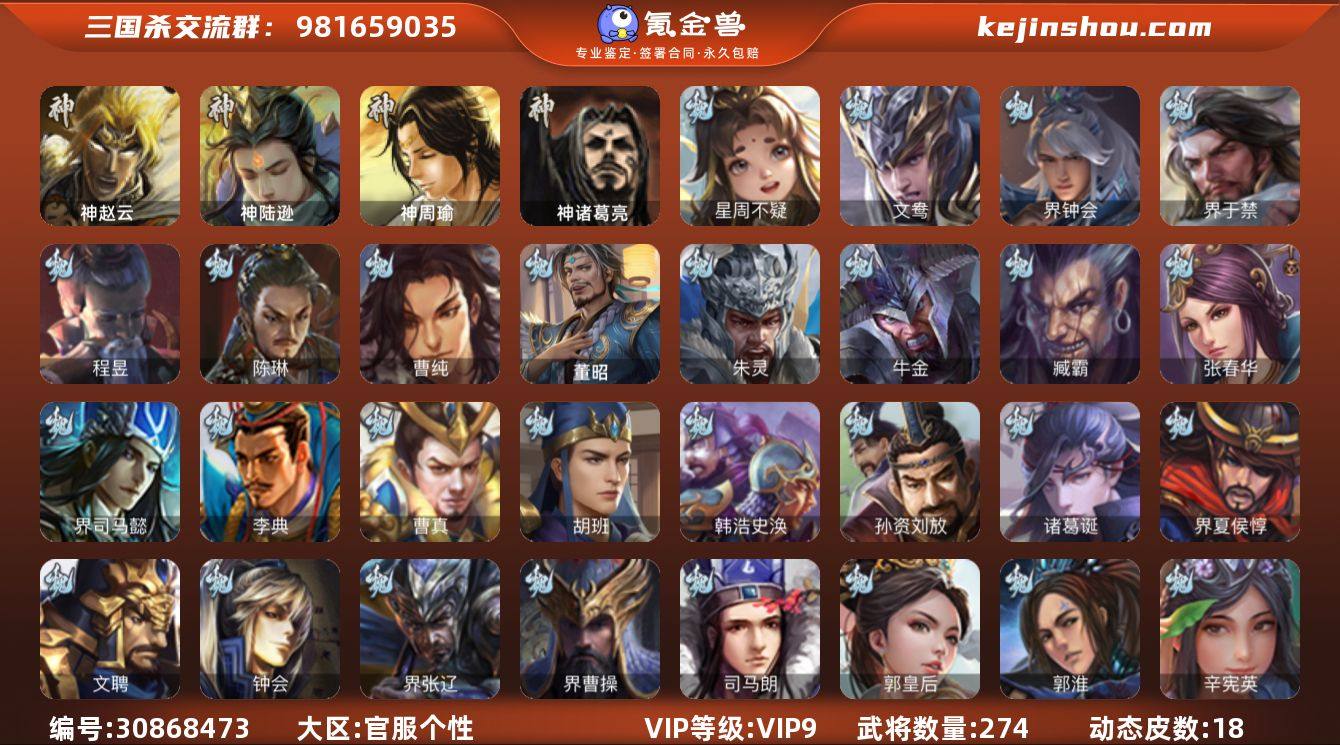 VIP等级: VIP9 官阶: 骠骑将军 武将数量: 274 动态皮肤数量: 18 神将: 神陆逊,神赵云,神周瑜,神诸葛亮 魏国武将: 曹纯,陈琳,程昱,界于禁,界钟会,文鸯,徐庶,张辽,SP蔡文姬,SP关羽,SP贾诩,SP姜维,SP庞德,蔡贞姬,曹昂,曹操,曹冲,曹洪,曹丕,曹仁,曹叡,曹嵩,王异,鲁芝,曹休,界曹植,满宠,荀攸,钟繇,郭嘉,荀彧,阮慧,杜畿,界郭嘉,崔琰,界荀彧,朱灵,吕虔,界王异,界许褚,华歆,陈群,李通,乐进,辛宪英,郭淮,郭皇后,夏侯惇,司马朗,界曹操,星周不疑,许褚,界张辽,谋徐晃,张郃,钟会,文聘,曹彰,界夏侯惇,诸葛诞,司马懿,甄姬,徐晃,孙资刘放,韩浩史涣,胡班,曹真,典韦,夏侯渊,李典,于禁,邓艾,界司马懿,张春华,臧霸,牛金,朱灵(国战),董昭 蜀国武将: 董允,关索,花鬘,傅佥,诸葛瞻,谋马超,马云騄,徐庶,界魏延,杨仪,界关羽,界诸葛亮,界伊籍,严颜,界张嶷,赵云,张松,界刘备,谋姜维,刘封,糜竺,谋庞统,黄月英,刘巴,关羽,吴懿,吴班,祝融,张飞,黄皓,陈震,魏延,界法正,糜夫人,刘禅,界赵云,关银屏,SP孙尚香,SP徐庶,卧龙诸葛,周仓,界关兴张苞,诸葛亮,法正,界简雍,赵统赵广,界马岱,关平,马岱,界庞统,庞统,诸葛果,谋张飞,马谡,马超,廖化,关兴张苞,孟获,夏侯氏,姜维,黄忠,刘备,马良,傅肜,蒋琬费祎,甘夫人,蜀-糜芳傅士仁,SP甘夫人 吴国武将: 界徐盛,文鸯,周泰,全琮,吕蒙,诸葛恪,界孙尚香,界顾雍,丁奉,谋吕蒙,界全琮,蒋钦,顾雍,严畯,界孙权,孙翊,界孙休,祖茂,濮阳兴,界吕蒙,陈武董袭,凌操,朱治,孙尚香,程普,大乔,韩当,陆逊,诸葛瑾,朱然,吕范,太史慈,虞翻,界黄盖,孙鲁班,界周瑜,界潘璋马忠,卫温诸葛直,孙权,鲁肃,界甘宁,吴国太,甘宁,界大乔,孙坚,孙鲁育,步练师,周瑜,小乔,潘璋马忠,黄盖,吕岱,孙策,界陆逊,界周泰,徐盛,张昭张纮,陈武蕫袭,吴-糜芳傅士仁,孙邵,朱桓 群国武将: 杜预,刘焉,兀突骨,许攸,谋陈宫,伏完,刘协,华雄,董白,刘琦,袁术,高顺,刘繇,界庞德,...