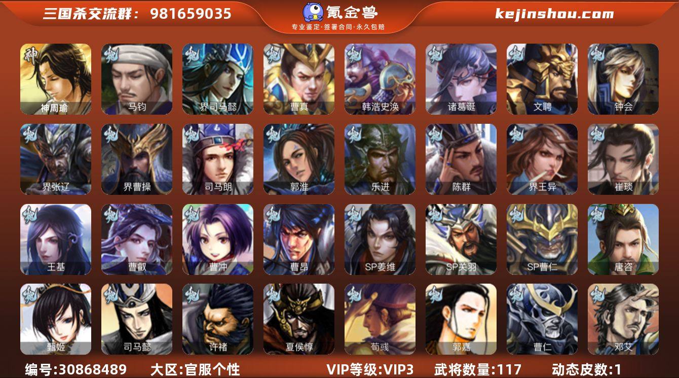 VIP等级: VIP3 官阶: 校尉 武将数量: 117 动态皮肤数量: 1 神将: 神周瑜 魏国武将: 马钧,唐咨-魏,徐庶,张辽,SP曹仁,SP关羽,SP姜维,曹昂,曹操,曹冲,曹丕,曹仁,曹叡,王基,郭嘉,荀彧,崔琰,界王异,陈群,乐进,郭淮,夏侯惇,司马朗,界曹操,许褚,界张辽,钟会,文聘,诸葛诞,司马懿,甄姬,韩浩史涣,曹真,夏侯渊,邓艾,界司马懿 蜀国武将: 徐庶,胡金定,界黄月英,界张嶷,赵云,张松,界刘备,黄月英,关羽,吴懿,张飞,魏延,刘禅,张翼,SP徐庶,周仓,诸葛亮,赵统赵广,界马岱,关平,马岱,庞统,马超,关兴张苞,孟获,黄忠,刘备,界马超,马良,甘夫人,SP甘夫人 吴国武将: 界徐盛,周泰,吕蒙,孙尚香,程普,大乔,韩当,陆逊,诸葛瑾,虞翻,界黄盖,孙鲁班,界周瑜,孙权,鲁肃,甘宁,界大乔,孙坚,周瑜,小乔,潘璋马忠,黄盖,孙策,界陆逊,吴-唐咨,张昭张纮 群国武将: 伏完,华雄,袁术,高顺,于吉,吕布,李儒,公孙瓒,SP赵云,蔡夫人,潘凤,界袁术,贾诩,张宝,董卓,张角,袁绍,华佗,貂蝉,颜良文丑,邹氏,贾充,马腾,纪灵