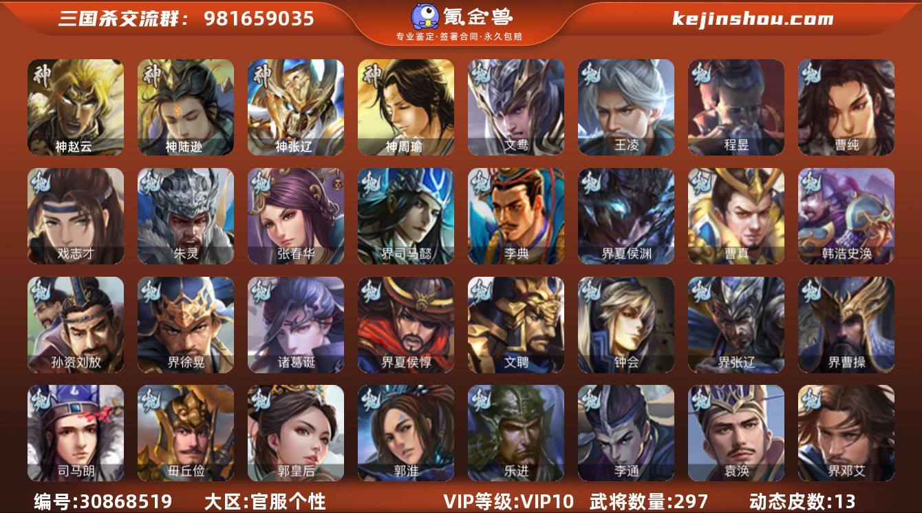 VIP等级: VIP10 官阶: 骠骑将军 武将数量: 297 动态皮肤数量: 13 神将: 神陆逊,神张辽,神赵云,神周瑜 魏国武将: 戏志才,曹纯,程昱,王凌,文鸯,徐庶,张辽,SP关羽,SP贾诩,SP姜维,SP庞德,卞夫人,曹昂,曹操,曹冲,曹洪,曹丕,曹仁,曹叡,王异,张恭,鲁芝,界满宠,曹休,界曹植,满宠,荀攸,王基,钟繇,郭嘉,荀彧,杜畿,界郭嘉,崔琰,界荀彧,朱灵,吕虔,界王异,华歆,陈群,界邓艾,袁涣,李通,乐进,郭淮,郭皇后,毌丘俭,夏侯惇,曹植,司马朗,谋于禁,界曹操,许褚,界张辽,张郃,钟会,文聘,曹彰,界夏侯惇,诸葛诞,司马懿,甄姬,界徐晃,徐晃,孙资刘放,韩浩史涣,曹真,典韦,界夏侯渊,夏侯渊,李典,于禁,邓艾,界司马懿,张春华,朱灵(国战) 蜀国武将: 关索,花鬘,王平,赵襄,周群,马云騄,徐庶,吕凯,界关羽,邓芝,界伊籍,严颜,界黄月英,赵云,张松,李丰,界刘备,刘封,糜竺,黄月英,关羽,吴懿,吴班,祝融,张飞,黄皓,魏延,界法正,糜夫人,刘禅,界赵云,界姜维,张翼,关银屏,SP孙尚香,SP徐庶,卧龙诸葛,周仓,简雍,界关兴张苞,诸葛亮,孙乾,法正,赵统赵广,陈到,界马岱,关平,马岱,界庞统,庞统,诸葛果,马谡,马超,廖化,关兴张苞,孟获,夏侯氏,姜维,黄忠,刘备,界马超,李严,马良,刘谌,甘夫人 吴国武将: 贺齐,界徐盛,界朱然,留赞,骆统,孙寒华,文鸯,潘濬,张温,周泰,全琮,吕蒙,SP庞统,诸葛恪,界孙尚香,界程普,许贡,丁奉,周鲂,孙茹,蒋钦,顾雍,孙亮,界朱治,孙休,严畯,界孙权,界孙休,界凌统,祖茂,步骘,界吕蒙,陈武董袭,孙登,界孙策,凌操,朱治,孙尚香,程普,大乔,韩当,陆逊,诸葛瑾,朱然,吕范,太史慈,周妃,虞翻,界黄盖,孙鲁班,界周瑜,孙权,鲁肃,界甘宁,吴国太,甘宁,界大乔,孙坚,孙鲁育,凌统,步练师,周瑜,小乔,潘璋马忠,黄盖,吕岱,孙策,界陆逊,界周泰,界吴国太,徐盛,张昭张纮,陈武蕫袭,界张昭张纮,朱桓 群国武将: 界李儒,沮授,麹义,士燮,兀突骨,许攸,杨彪,左慈,伏完,界蔡文姬,刘协,界华雄...