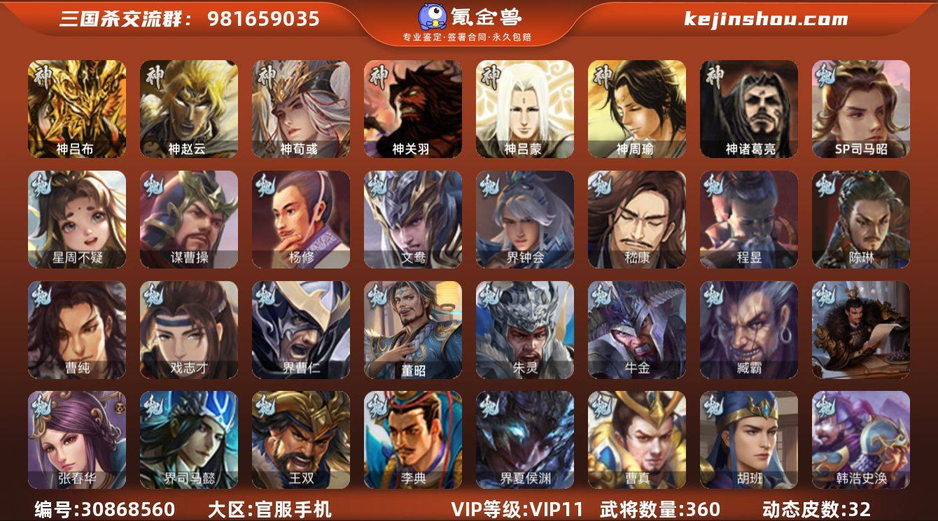 VIP等级: VIP11 官阶: 大将军 武将数量: 360 动态皮肤数量: 32 神将: 神吕布,神荀彧,神赵云,神关羽,神吕蒙,神周瑜,神诸葛亮 魏国武将: 戏志才,曹纯,陈琳,程昱,嵇康,界钟会,文鸯,杨修,谋曹操,唐咨-魏,张辽,SP蔡文姬,SP曹仁,SP关羽,SP贾诩,SP姜维,SP庞德,卞夫人,曹昂,曹操,曹冲,曹洪,曹丕,曹仁,曹叡,王异,张恭,鲁芝,曹休,界曹植,满宠,荀攸,王基,钟繇,蒯越蒯良,郭嘉,荀彧,杜畿,界郭嘉,崔琰,界曹丕,界荀彧,朱灵,界甄姬,吕虔,界王异,界许褚,界郭淮,华歆,陈群,界典韦,界曹休,李通,乐进,辛宪英,郭淮,界曹彰,郭皇后,毌丘俭,夏侯惇,曹植,司马朗,谋于禁,界曹操,星周不疑,许褚,界张辽,谋徐晃,张郃,钟会,文聘,曹彰,界夏侯惇,诸葛诞,司马懿,甄姬,界徐晃,徐晃,界曹仁,孙资刘放,韩浩史涣,胡班,曹真,典韦,界夏侯渊,夏侯渊,李典,于禁,王双,邓艾,界司马懿,张春华,孟达-魏,臧霸,牛金,朱灵(国战),SP司马昭,董昭 蜀国武将: 关索,花鬘,界黄忠,沙摩柯,张星彩,赵襄,诸葛瞻,谋马超,马云騄,徐庶,界魏延,杨仪,吕凯,界关羽,界诸葛亮,邓芝,界伊籍,严颜,界黄月英,赵云,张松,彭羕,李丰,界刘备,界刘禅,谋姜维,刘封,糜竺,李遗,黄月英,刘巴,关羽,王甫赵累,吴懿,祝融,张飞,黄皓,魏延,界周仓,马忠,界法正,糜夫人,界孟获,刘禅,界赵云,界姜维,关银屏,界祝融,SP孙尚香,SP徐庶,卧龙诸葛,宗预,周仓,简雍,界关兴张苞,诸葛亮,孙乾,界张飞,界卧龙诸葛,法正,赵统赵广,陈到,界马岱,关平,马岱,界庞统,庞统,诸葛果,谋张飞,马谡,马超,廖化,关兴张苞,孟获,秦宓,吴苋,夏侯氏,姜维,黄忠,刘备,界马超,李严,马良,蒋琬费祎,刘谌,蜀-孟达,彭羕(国战),甘夫人,蜀-糜芳傅士仁 吴国武将: 贺齐,界步练师,界徐盛,留赞,骆统,文鸯,潘濬,周泰,全琮,吕蒙,SP庞统,诸葛恪,界孙尚香,大乔小乔,桥公,界程普,许贡,丁奉,谋吕蒙,周鲂,孙茹,薛综,蒋钦,顾雍,阚泽,界朱治,孙休,严畯,界孙权,界凌统...
