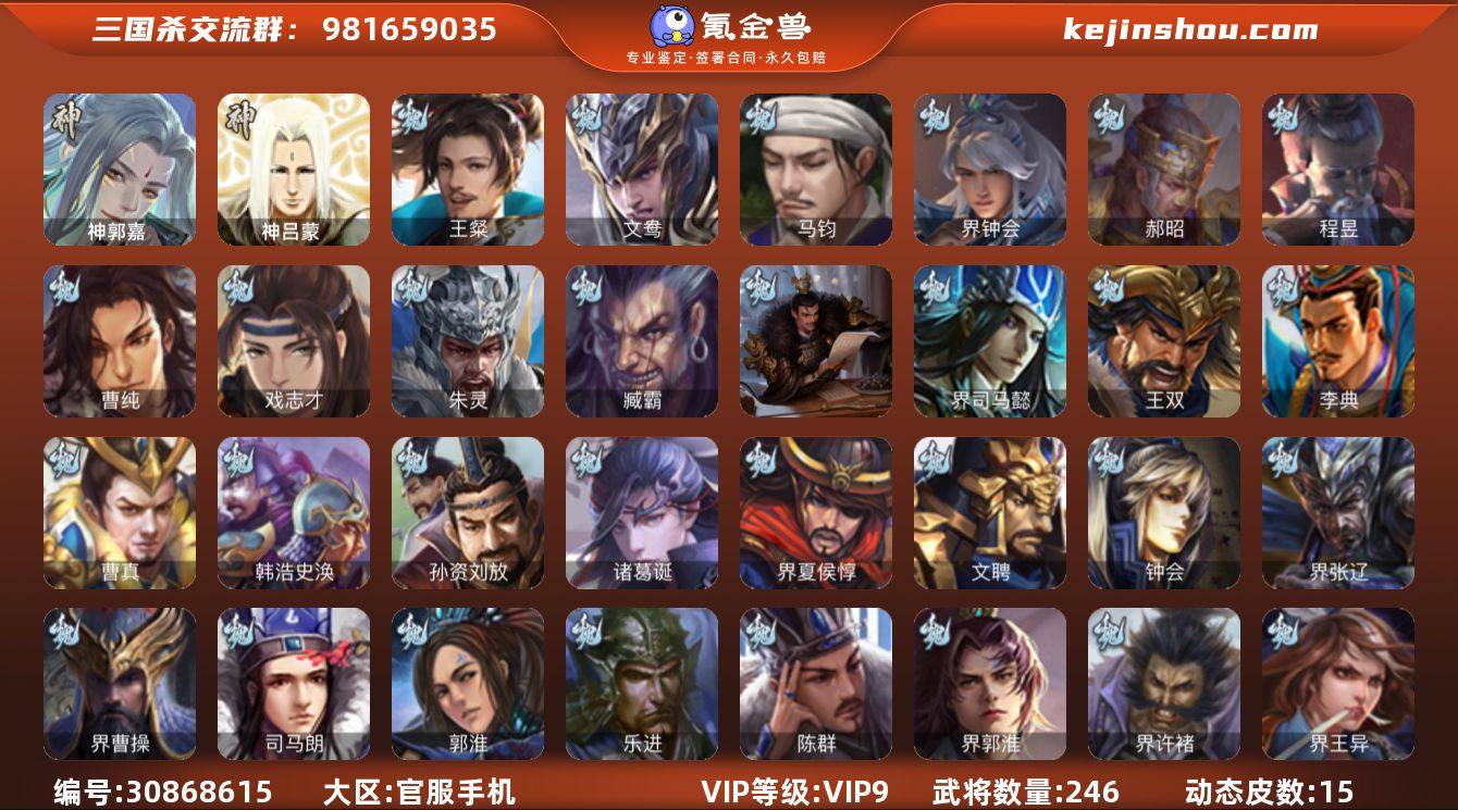VIP等级: VIP9 官阶: 骠骑将军 武将数量: 246 动态皮肤数量: 15 神将: 神郭嘉,神吕蒙 魏国武将: 戏志才,曹纯,程昱,郝昭,界钟会,马钧,文鸯,王粲,唐咨-魏,徐庶,张辽,SP关羽,SP姜维,SP庞德,卞夫人,曹昂,曹操,曹冲,曹洪,曹丕,曹仁,曹叡,王异,鲁芝,界满宠,曹休,界曹植,满宠,荀攸,王基,钟繇,郭嘉,荀彧,阮慧,界郭嘉,崔琰,界荀彧,朱灵,吕虔,界王异,界许褚,界郭淮,陈群,乐进,郭淮,夏侯惇,曹植,司马朗,界曹操,许褚,界张辽,谋徐晃,张郃,钟会,文聘,曹彰,界夏侯惇,诸葛诞,司马懿,甄姬,徐晃,孙资刘放,韩浩史涣,曹真,典韦,夏侯渊,李典,于禁,王双,邓艾,界司马懿,孟达-魏,臧霸,朱灵(国战) 蜀国武将: 董允,花鬘,谯周,谋马超,徐庶,界魏延,杨仪,界伊籍,费祎,界黄月英,赵云,张松,彭羕,李丰,界刘备,谋姜维,刘封,谋庞统,黄月英,关羽,王甫赵累,吴懿,祝融,张飞,黄皓,魏延,界周仓,马忠,界法正,糜夫人,刘禅,张翼,关银屏,SP孙尚香,SP徐庶,卧龙诸葛,周仓,简雍,界关兴张苞,诸葛亮,界张飞,法正,赵统赵广,界马岱,关平,马岱,庞统,诸葛果,马谡,马超,廖化,关兴张苞,孟获,夏侯氏,黄忠,刘备,界马超,马良,蒋琬费祎,刘谌,蜀-孟达,彭羕(国战),甘夫人,SP甘夫人 吴国武将: 界徐盛,骆统,文鸯,潘濬,周泰,全琮,吕蒙,诸葛恪,界孙尚香,大乔小乔,谋甘宁,许贡,丁奉,谋吕蒙,孙茹,顾雍,孙亮,孙休,严畯,界孙权,界孙休,界吕蒙,凌操,谋黄盖,孙尚香,程普,大乔,韩当,陆逊,诸葛瑾,吕范,太史慈,虞翻,界黄盖,孙鲁班,界周瑜,孙权,谋小乔,鲁肃,界甘宁,吴国太,甘宁,界大乔,孙坚,孙鲁育,步练师,周瑜,小乔,潘璋马忠,黄盖,吕岱,界陆逊,吴-唐咨,徐盛,张昭张纮,朱桓 群国武将: 麹义,兀突骨,左慈,伏完,华雄,董白,刘琦,袁术,高顺,刘繇,界庞德,于吉,界公孙瓒,吕布,马日磾,李儒,张济,公孙瓒,SP赵云,蔡夫人,界刘表,樊稠,界张角,潘凤,界袁术,陈宫,SP马超,蹋顿,界华佗,贾诩,羊祜,庞德,张宝,刘...