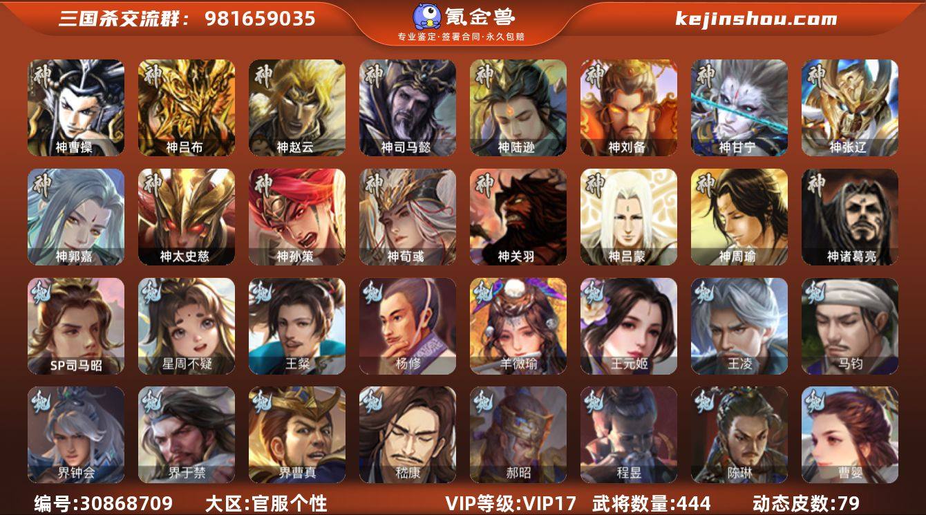 VIP等级: VIP17 官阶: 大将军 武将数量: 444 动态皮肤数量: 79 神将: 神曹操,神甘宁,神郭嘉,神刘备,神陆逊,神吕布,神司马懿,神孙策,神太史慈,神荀彧,神张辽,神赵云,神关羽,神吕蒙,神周瑜,神诸葛亮 魏国武将: 刘晔,戏志才,曹纯,曹婴,陈琳,程昱,郝昭,嵇康,界曹真,界于禁,界钟会,马钧,王凌,王元姬,羊徽瑜,杨修,王粲,唐咨-魏,张辽,SP蔡文姬,SP曹仁,SP关羽,SP贾诩,SP姜维,SP庞德,卞夫人,蔡贞姬,曹昂,曹操,曹冲,曹洪,曹丕,曹仁,曹叡,曹嵩,贾逵,王异,张恭,鲁芝,界满宠,曹休,界曹植,满宠,荀攸,王基,钟繇,蒯越蒯良,郭嘉,荀彧,阮慧,杜畿,界郭嘉,崔琰,界曹丕,界荀彧,朱灵,界甄姬,吕虔,界王异,界许褚,界郭淮,华歆,陈群,界邓艾,界典韦,袁涣,李通,乐进,辛宪英,郭淮,毛玠,郭皇后,毌丘俭,夏侯惇,曹植,司马朗,谋于禁,界曹操,星周不疑,许褚,界张辽,张郃,钟会,文聘,曹彰,界夏侯惇,诸葛诞,司马懿,甄姬,界徐晃,徐晃,界曹仁,孙资刘放,韩浩史涣,胡班,曹真,典韦,界夏侯渊,夏侯渊,李典,于禁,王双,邓艾,界司马懿,张春华,孟达-魏,臧霸,牛金,朱灵(国战),SP司马昭,董昭,谋夏侯渊 蜀国武将: 董允,关索,花鬘,界黄忠,沙摩柯,王平,张星彩,赵襄,周群,诸葛瞻,谋马超,谋赵云,马云騄,徐庶,界魏延,杨仪,吕凯,界关羽,界诸葛亮,邓芝,界伊籍,胡金定,费祎,严颜,界黄月英,界张嶷,赵云,张松,彭羕,李丰,界刘备,界刘禅,谋姜维,刘封,糜竺,谋庞统,黄月英,刘巴,关羽,王甫赵累,吴懿,吴班,界吴懿,界廖化,祝融,张飞,黄皓,陈震,魏延,界周仓,谋祝融,马忠,界法正,糜夫人,界孟获,刘禅,界赵云,界姜维,张翼,关银屏,界祝融,SP孙尚香,SP徐庶,卧龙诸葛,宗预,周仓,简雍,谋孟获,界关兴张苞,诸葛亮,孙乾,界张飞,界卧龙诸葛,法正,界简雍,赵统赵广,陈到,界马岱,关平,马岱,界庞统,庞统,诸葛果,谋张飞,马谡,马超,来敏,廖化,关兴张苞,孟获,秦宓,吴苋,夏侯氏,姜维,黄忠,刘备,界马超,李严,...