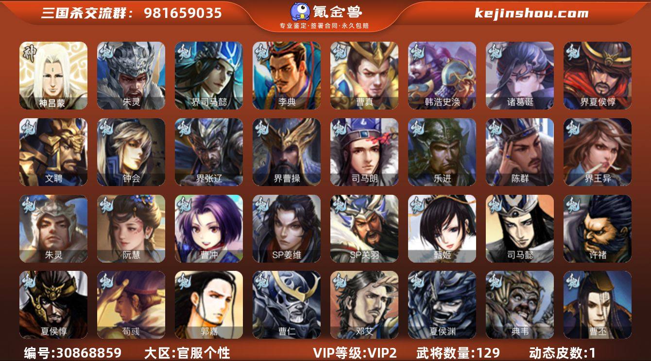 VIP等级: VIP2 官阶: 校尉 武将数量: 129 动态皮肤数量: 1 神将: 神吕蒙 魏国武将: 张辽,SP关羽,SP姜维,SP庞德,曹操,曹冲,曹丕,曹仁,郭嘉,荀彧,阮慧,朱灵,界王异,陈群,乐进,夏侯惇,曹植,司马朗,界曹操,许褚,界张辽,钟会,文聘,界夏侯惇,诸葛诞,司马懿,甄姬,徐晃,韩浩史涣,曹真,典韦,夏侯渊,李典,邓艾,界司马懿,朱灵(国战) 蜀国武将: 邓芝,严颜,赵云,张松,李丰,界刘备,刘封,黄月英,关羽,吴懿,祝融,张飞,魏延,界法正,糜夫人,刘禅,SP孙尚香,SP徐庶,周仓,界关兴张苞,诸葛亮,界张飞,法正,界马岱,庞统,马谡,马超,廖化,关兴张苞,谋关羽,孟获,黄忠,刘备,界马超,马良,甘夫人,SP甘夫人 吴国武将: 吴景,周泰,吕蒙,诸葛恪,周鲂,界孙权,界吕蒙,孙尚香,程普,大乔,韩当,陆逊,虞翻,界黄盖,孙鲁班,界周瑜,孙权,界甘宁,甘宁,界大乔,孙坚,凌统,步练师,周瑜,小乔,潘璋马忠,黄盖,孙策,界陆逊,张昭张纮 群国武将: 伏完,刘协,华雄,袁术,高顺,于吉,吕布,李儒,SP赵云,蔡夫人,界袁术,SP马超,界华佗,贾诩,刘表,张角,袁绍,华佗,貂蝉,伏皇后,界吕布,颜良文丑,谋高顺,贾充,友庞统