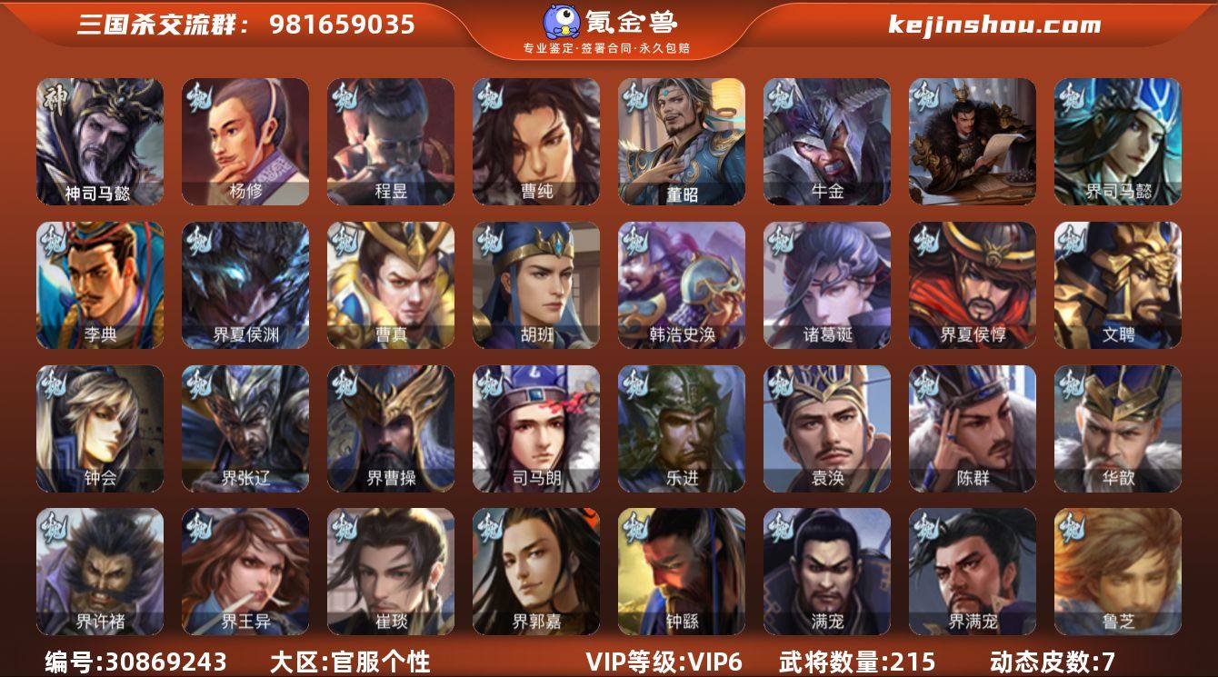 VIP等级: VIP6 官阶: 领军将军 武将数量: 215 动态皮肤数量: 7 神将: 神司马懿 魏国武将: 曹纯,程昱,杨修,唐咨-魏,张辽,SP关羽,SP贾诩,SP姜维,SP庞德,卞夫人,蔡贞姬,曹昂,曹操,曹冲,曹丕,曹仁,王异,鲁芝,界满宠,界曹植,满宠,荀攸,钟繇,郭嘉,荀彧,界郭嘉,崔琰,界王异,界许褚,华歆,陈群,袁涣,乐进,夏侯惇,曹植,司马朗,谋于禁,界曹操,许褚,界张辽,张郃,钟会,文聘,曹彰,界夏侯惇,诸葛诞,司马懿,甄姬,徐晃,韩浩史涣,胡班,曹真,典韦,界夏侯渊,夏侯渊,李典,于禁,邓艾,界司马懿,孟达-魏,牛金,董昭 蜀国武将: 花鬘,谯周,谋赵云,徐庶,杨仪,界关羽,界伊籍,严颜,界张嶷,赵云,张松,界刘备,刘封,谋庞统,黄月英,关羽,吴懿,祝融,张飞,魏延,马忠,界法正,界孟获,刘禅,界赵云,关银屏,界祝融,SP孙尚香,SP徐庶,卧龙诸葛,周仓,界关兴张苞,诸葛亮,法正,界马岱,关平,马岱,界庞统,庞统,诸葛果,马谡,马超,廖化,关兴张苞,孟获,姜维,黄忠,刘备,马良,蒋琬费祎,蜀-孟达,甘夫人,SP甘夫人 吴国武将: 界徐盛,周泰,全琮,吕蒙,诸葛恪,界顾雍,谋周瑜,丁奉,蒋钦,顾雍,界孙权,祖茂,界吕蒙,孙登,凌操,朱治,孙尚香,程普,大乔,韩当,陆逊,诸葛瑾,朱然,太史慈,虞翻,界黄盖,孙鲁班,界周瑜,孙权,界孙鲁班,界甘宁,吴国太,甘宁,界大乔,孙坚,孙鲁育,周瑜,小乔,潘璋马忠,黄盖,孙策,界陆逊,吴-唐咨,徐盛,张昭张纮,孙邵,朱桓 群国武将: 左慈,伏完,华雄,袁术,高顺,界庞德,于吉,界公孙瓒,吕布,李儒,公孙瓒,SP赵云,胡车儿,王濬,蔡夫人,界刘表,樊稠,潘凤,界袁术,陈宫,SP马超,谋张角,界华佗,贾诩,羊祜,庞德,张宝,荀谌,刘表,董卓,何太后,界董卓,谋卢植,张角,SP黄月英,曹节,袁绍,华佗,貂蝉,伏皇后,界伏皇后,严白虎,公孙渊,颜良文丑,界高顺,李傕郭汜,何进,邹氏,马腾,纪灵,田丰
