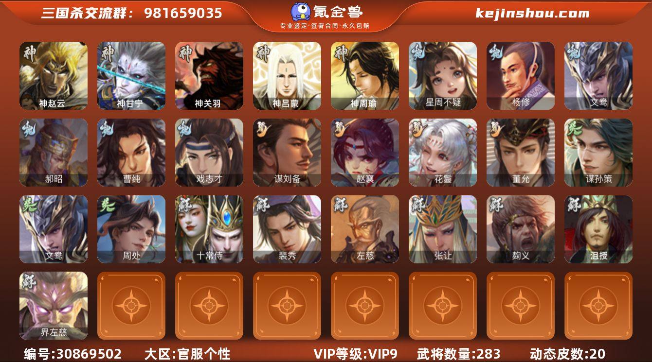 官阶:大将军;VIP等级:VIP9;史诗武将数量:44;动态皮肤数量:58;武将总数:386;史诗宝珠数量:16;将魂数量:722;神将:4;魏国史诗武将:26;蜀国史诗武将:9;吴国史诗武将:6;群史诗武将:13 神赵云,神孙策,神吕蒙,神周瑜,SP司马昭,星周不疑,王粲,文鸯,王元姬,界钟会,界于禁,界曹真,嵇康,郝昭,曹纯,戏志才,谋曹丕,马云騄,谋赵云,谋马超,诸葛瞻,张星彩,沙摩柯,界黄忠,花鬘,董允,骆统,留赞,界朱然,界徐盛,界步练师,贺齐,左慈,张仲景,星甘宁,陶谦,苏飞,南华老仙,沮授,界左慈,界李儒,公孙康,卑弥呼,鲍信,张绣,神关羽-血海罗刹(动态),钟会-潜蛟觊天(动态),甄姬-明珠耀躯(动态),SP蔡文姬-兔年冬日(动态),许褚-虎啸生风(动态),郭嘉-十胜十败(动态),荀彧-驱虎吞狼(动态),界许褚-虎啸生风(动态),界郭嘉-十胜十败(动态),曹真-虎年春节(动态),曹昂-竭战麟伤(动态),戏志才-举棋若定(动态),曹婴-兔年春节(动态),曹纯-长坂败备(动态),诸葛亮-龙年限定(动态),卧龙诸葛-龙跃凤鸣(动态),刘备-龙骧麟振(动态),马超-牛年春节(动态),马超-虎年冬至(动态),黄月英-鼠年春节(动态),诸葛亮-明良千古(动态),诸葛瞻-绵竹之殇(动态),界刘备-龙骧麟振(动态),界马超-牛年春节(动态),界诸葛亮-明良千古(动态),界黄月英-鼠年春节(动态),关银屏-兔年春节(动态),鲍三娘-虎年七夕(动态),周处-义除三害(动态),吕蒙-剑起惊澜(动态),孙权-永开吴祚(动态),孙策-虎踞江东(动态),文鸯-破宇开天(动态),孙权-猪年端午(动态),孙尚香-兔年春节(动态),孙尚香-星流霆击(动态),界孙权-猪年端午(动态),界孙尚香-星流霆击(动态),徐盛-破军杀将(动态),步练师-牛年七夕(动态),界步练师-牛年七夕(动态),孙鲁育-牛年端午(动态),孙茹-鱼游濠水(动态),许攸-盛气凌人(动态),兀突骨-鼠年春节(动态),星甘宁-肝胆相照(动态)