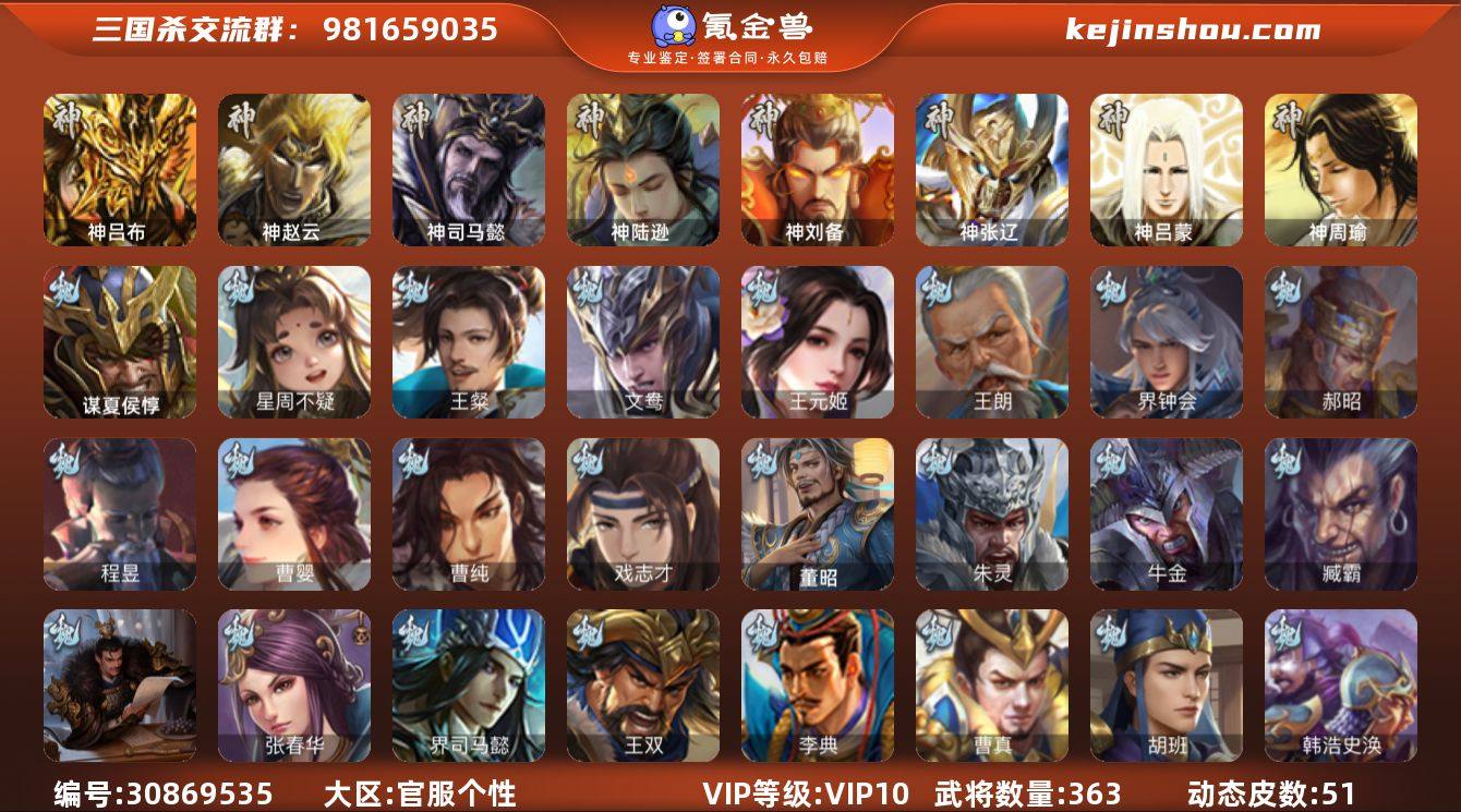 VIP等级: VIP10 官阶: 大将军 武将数量: 363 动态皮肤数量: 51 神将: 神刘备,神陆逊,神吕布,神司马懿,神张辽,神赵云,神吕蒙,神周瑜 魏国武将: 戏志才,曹纯,曹婴,程昱,郝昭,界钟会,王朗,王元姬,文鸯,王粲,徐庶,张辽,SP蔡文姬,SP关羽,SP贾诩,SP姜维,SP庞德,卞夫人,曹昂,曹操,曹冲,曹洪,曹丕,曹仁,曹叡,曹嵩,王异,张恭,鲁芝,曹休,界曹植,满宠,荀攸,钟繇,郭嘉,牵招,荀彧,杜畿,界郭嘉,崔琰,界曹丕,界荀彧,朱灵,吕虔,界王异,界许褚,界郭淮,华歆,陈群,界邓艾,界典韦,界曹休,谋甄姬,司马孚,袁涣,李通,乐进,辛宪英,郭淮,郭皇后,夏侯惇,曹植,司马朗,谋于禁,界曹操,星周不疑,许褚,界张辽,谋徐晃,张郃,钟会,文聘,曹彰,界夏侯惇,诸葛诞,司马懿,甄姬,徐晃,孙资刘放,韩浩史涣,胡班,曹真,典韦,夏侯渊,李典,于禁,王双,邓艾,界司马懿,张春华,孟达-魏,臧霸,牛金,朱灵(国战),谋夏侯惇,董昭 蜀国武将: 董允,关索,花鬘,谯周,沙摩柯,赵襄,诸葛瞻,谋马超,谋赵云,马云騄,徐庶,杨仪,吕凯,界关羽,界诸葛亮,邓芝,界伊籍,费祎,界黄月英,界张嶷,赵云,张松,彭羕,李丰,界刘备,界刘禅,谋姜维,刘封,糜竺,谋庞统,黄月英,刘巴,关羽,吴懿,吴班,祝融,张飞,黄皓,魏延,界周仓,谋祝融,马忠,界法正,糜夫人,刘禅,界赵云,谋诸葛亮,界姜维,张翼,关银屏,SP孙尚香,SP徐庶,卧龙诸葛,周仓,简雍,谋孟获,界关兴张苞,诸葛亮,界张飞,法正,赵统赵广,界马岱,关平,马岱,界庞统,庞统,诸葛果,谋张飞,马谡,马超,霍峻,廖化,关兴张苞,孟获,夏侯氏,姜维,黄忠,刘备,界马超,李严,马良,蒋琬费祎,刘谌,蜀-孟达,彭羕(国战),甘夫人,SP甘夫人 吴国武将: 界徐盛,留赞,骆统,吴景,文鸯,潘濬,周泰,全琮,吕蒙,诸葛恪,界孙尚香,界顾雍,大乔小乔,桥公,谋周瑜,许贡,丁奉,谋吕蒙,界全琮,孙茹,蒋钦,顾雍,界朱治,孙休,严畯,界孙权,孙翊,界孙休,界凌统,祖茂,濮阳兴,界虞翻,陆抗,陈武董袭,孙登,凌操,朱...