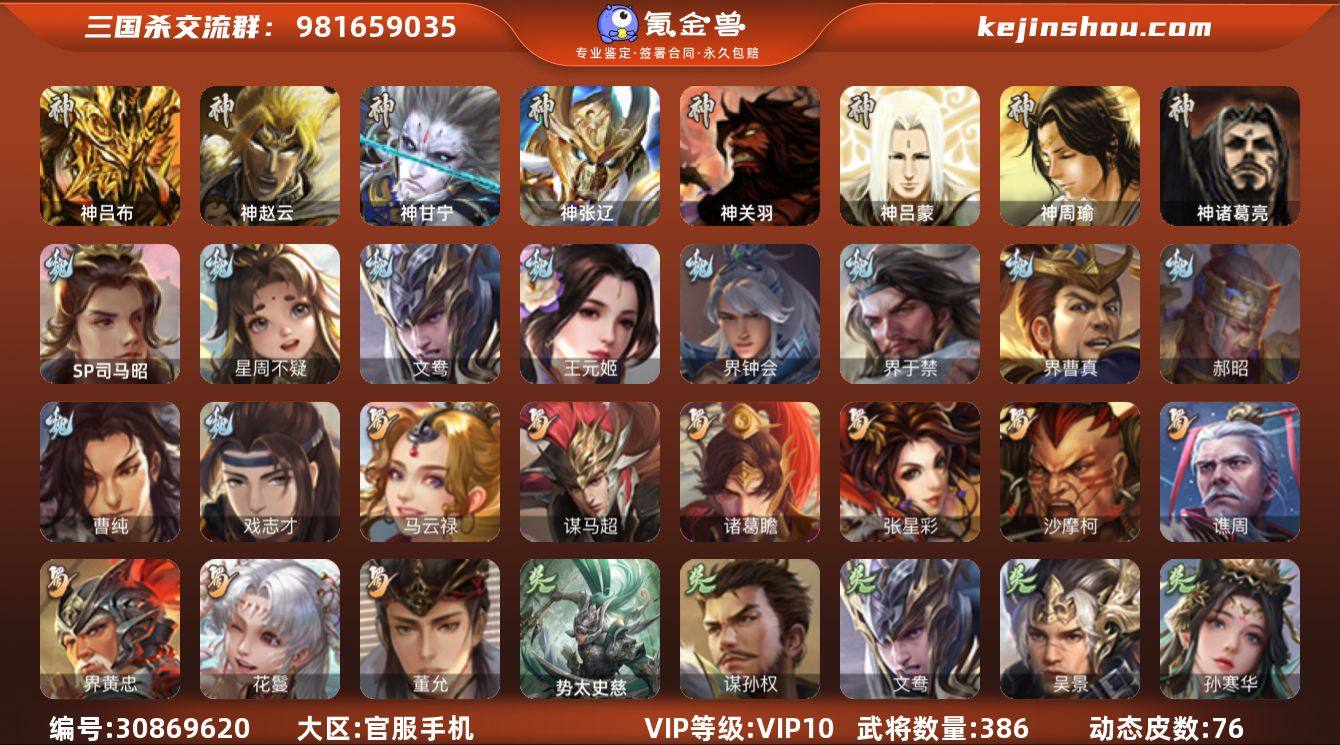 【685】官阶:大将军;VIP等级:VIP10;史诗武将数量:43;动态皮肤数量:76;武将总数:386;史诗宝珠数量:0;将魂数量:13192;神将:8;魏国史诗武将:27;蜀国史诗武将:9;吴国史诗武将:8;群史诗武将:13 神吕布,神赵云,神甘宁,神张辽,神关羽,神吕蒙,神周瑜,神诸葛亮,SP司马昭,星周不疑,文鸯,王元姬,界钟会,界于禁,界曹真,郝昭,曹纯,戏志才,马云騄,谋马超,诸葛瞻,张星彩,沙摩柯,谯周,界黄忠,花鬘,董允,吴景,孙寒华,骆统,界朱然,界徐盛,贺齐,谋孙权,势太史慈,左慈,张让,星黄忠,麹义,沮授,界左慈,界李儒,公孙康,卑弥呼,张绣,李傕,阎象,许攸,神甘宁-万人辟易(动态),神吕蒙-兼资文武(动态),神周瑜-陵光引灵(动态),神赵云-战龙在野(动态),钟会-潜蛟觊天(动态),曹丕-气荡山河(动态),甄姬-明珠耀躯(动态),SP蔡文姬-兔年冬日(动态),甄姬-牛年清明(动态),邓艾-神兵天降(动态),界甄姬-牛年清明(动态),界邓艾-神兵天降(动态),张春华-雪中舞刃(动态),辛宪英-鼠年春节(动态),戏志才-举棋若定(动态),朱灵-以战破氐(动态),曹纯-长坂败备(动态),王元姬-鼠年冬至(动态),司马昭-昭威淮南(动态),刘备-龙骧麟振(动态),刘备-明良千古(动态),马超-牛年春节(动态),黄月英-鼠年春节(动态),界刘备-龙骧麟振(动态),界刘备-明良千古(动态),界马超-牛年春节(动态),界黄月英-鼠年春节(动态),SP孙尚香-明良千古(动态),关银屏-兔年春节(动态),张星彩-临军对阵(动态),关索-虎年七夕(动态),鲍三娘-虎年七夕(动态),诸葛果-蛇年限定(动态),太史慈-涤荡江东(动态),周处-义除三害(动态),吕蒙-剑起惊澜(动态),孙权-兔年中秋(动态),孙权-永开吴祚(动态),孙策-虎踞江东(动态),孙寒华-莲华熠熠(动态),孙寒华-威灵尽显(动态),黄盖-鏖战赤壁(动态),孙权-吴王六剑(动态),孙尚香-星流霆击(动态),大乔-猪年七夕(动态),周瑜-鼠年春节(动态),鲁肃-联刘抗曹(动态),...