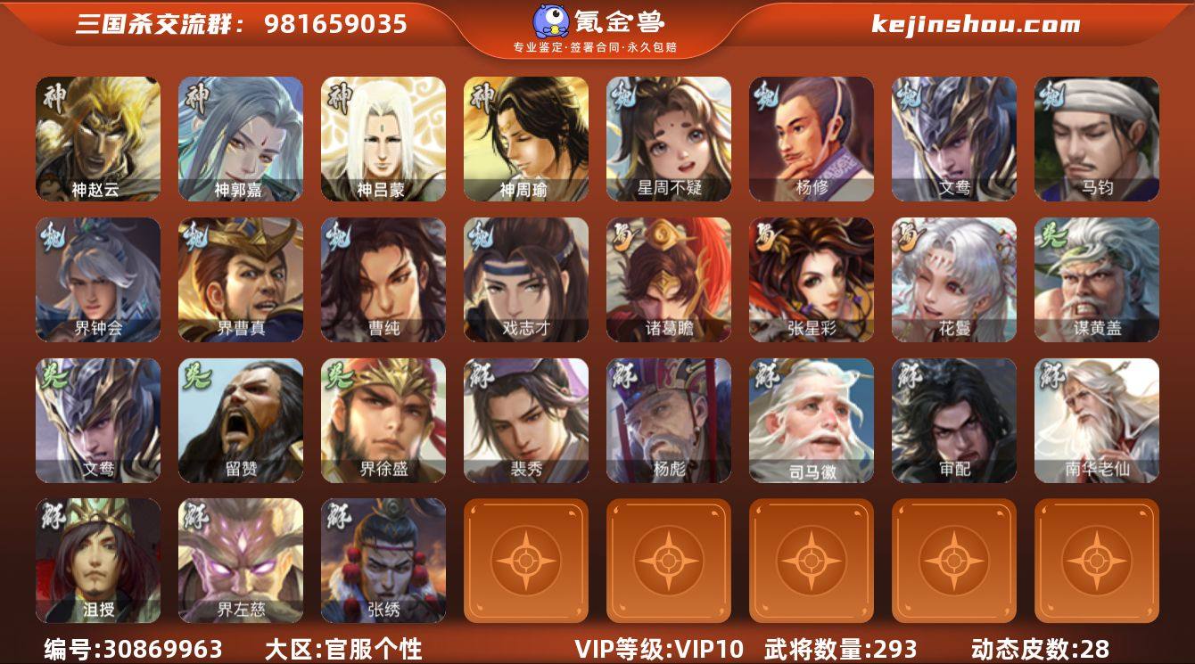官阶:骠骑将军;VIP等级:VIP10;史诗武将数量:30;动态皮肤数量:47;武将总数:328;史诗宝珠数量:4;将魂数量:1928;神将:5;魏国史诗武将:20;蜀国史诗武将:8;吴国史诗武将:2;群史诗武将:9 神吕布,神赵云,神郭嘉,神吕蒙,神周瑜,杨修,文鸯,界于禁,嵇康,陈琳,曹纯,戏志才,谋黄忠,谋赵云,谋马超,诸葛瞻,赵襄,谯周,花鬘,董允,孙寒华,界徐盛,谋黄月英,界沮授,左慈,张让,星甘宁,麹义,南华老仙,刘焉,沮授,神郭嘉-虎年清明(动态),神太史慈-勇撼日月(动态),钟会-潜蛟觊天(动态),曹丕-气荡山河(动态),甄姬-明珠耀躯(动态),张春华-雪中舞刃(动态),程昱-泰山捧日(动态),戏志才-举棋若定(动态),曹婴-兔年春节(动态),曹纯-虎年春节(动态),羊徽瑜-牛年中秋(动态),司马师-牛年中秋(动态),刘备-龙御天下(动态),费祎-安民护祚(动态),诸葛瞻-绵竹之殇(动态),关索-虎年七夕(动态),李丰-太仓聚粟(动态),孙策-兔年清明(动态),周处-义除三害(动态),孙权-永开吴祚(动态),孙策-虎踞江东(动态),孙寒华-威灵尽显(动态),周瑜-免年清明(动态),小乔-猪年大雪(动态),徐盛-破军杀将(动态),文鸯-势若万钧(动态),貂蝉-舞惑群心(动态),袁绍-声震寰宇(动态),谋刘赪-明良千古(动态),刘焉-雄踞益州(动态),苏飞-肝胆相照(动态),星甘宁-肝胆相照(动态),南华老仙-野鹤闲云(动态)