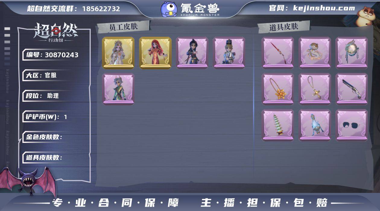 Z5039+皮肤:巫铃儿-镜生遗梦 圣光之谕 镜花辞 王子与骑士 泽引山海 绣春逍影 道具: 星光的裁决 金丝眼镜 花落精绝 祝祷词 伏妖塔 小狗蛇点点鞭 昆仑镜 青玉抱丹 凤鸣九天 桃心