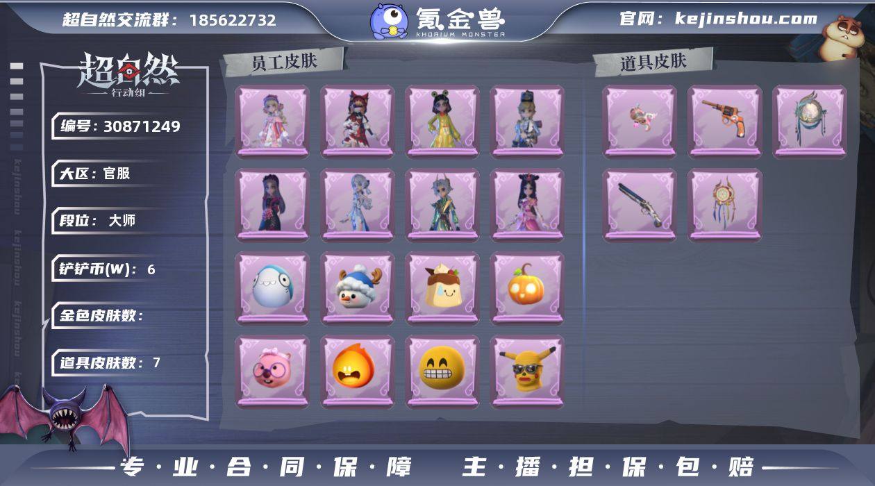 087紫色皮肤数量: 8 道具皮肤数量: 7 段位: 大师 员工: 逍遥,薇薇安,巫铃儿,莉莉,阿念,艾伦,小黄,零,爱丽丝,爱德华,兰 外观: 王子与骑士,丝缕哀歌,素影瑶光,泽引山海,罗丽,嘻嘻头套,烈焰红唇头套,呆滞头套,炙热烧烤,卑微头套,哈士奇头套,滑稽头套,鳄霸天头套,鱼头怪头套,面具马头套,萨卡班甲鱼头套,咬咬鲨头套,龙傲天头套,小鲨包包,未竟乐园,天使消失的年代,钗头凤,呱呱雨衣,九色祥鹿,火爆了头套,精致露比头套,惊魂南瓜,莓果陷阱,潮汐小海兔,甜梦派对,樱桃奶油布丁,雪墩墩头套,太空鲨头套,子夜证词