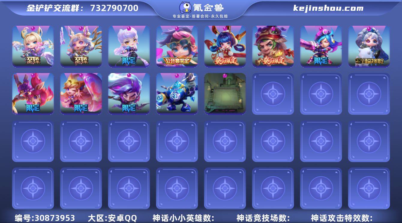 [10100852]【香冻梨花雨 兔年全套瑞兔呈祥 至臻格温阿狸+11神话多女神话+虎兔斗气击】可二次-安卓q 小小英雄(神话)(13) 至臻 剪纸仙灵 小小格温,剪纸仙灵 小小格温,龙腾虎跃 小小瑟提,电玩女神 小小凯特琳,电玩女神 小小娑娜,银河三连星,神龙尊者 夜月幻龙 小小亚索,EDG 银龙骑士 小小佐伊,星之守护者 小小拉克丝,星之守护者 小小阿狸,泳池派对 小小菲奥娜(TheShy纪念限定),至臻 K/DA ALL OUT 小小阿狸,K/DA ALL OUT 小小伊芙琳 竞技场(神话)(1) 幻境竞技场 竞技场(英雄)(3) 剪纸花灯,2022 全球总决赛 此志无双,铲铲市足球场 竞技场(传说)(7) 金克丝的卧室,云海九天,夜战城楼,铲铲市美食步行街,金铲铲立交桥广场,德玛西亚团结圣坛,三周年蛋糕城堡 攻击特效(神话)(2) 虎兔斗气击,加里奥登场