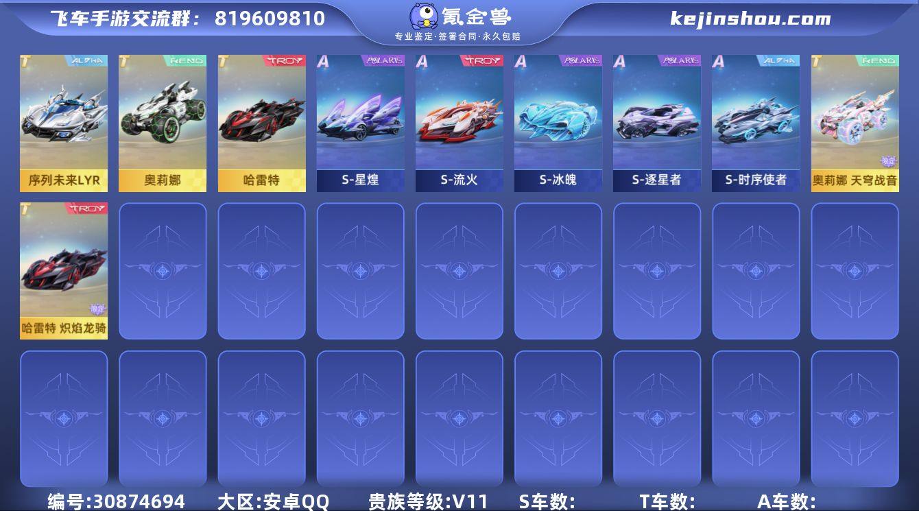 B653405 【8T+骑宠+幻生 A车数量114 游戏等级98 T车数量8 【是】 【可二次实名】 【永久包赔】 【安卓QQ】 稀有车型4 稀有永久A车6 T车皮肤7 永久T车7 宠物14 稀有车型:炎君,孙悟空,哈雷特,墨影青龙; 稀有永久A车:海神,驭龙雷诺,玉兔雷诺,L-清,酷喵雷诺,龙珏雷诺; T车皮肤:源极之星黑曜石,序列未来燃冰球手,孙悟空齐天大圣,源极之星星穹之矢,奥莉娜天穹战音,哈雷特炽焰龙骑,墨影青龙敖丙; 永久T车:源极之星EXA,序列未来LYR,孙悟空,奥莉娜,哈雷特,墨影青龙,鸭宝超人; 宠物:极地龙龟,彩虹独角兽,无常小黑,避水金晶兽,女娲,源梦之星,魔王天狮,雀焰女王,玉玺神虎,瑞泽祥麟,小悟空,小妲己,加鲁鲁兽,铠甲战士;】 A车数量114 游戏等级98 T车数量8 【否】 【可二次实名】 【永久包赔】 【安卓QQ】 稀有车型4 稀有永久A车6 T车皮肤7 永久T车7 宠物14 稀有车型:炎君,孙悟空,哈雷特,墨影青龙; 稀有永久A车:海神,驭龙雷诺,玉兔雷诺,L-清,酷喵雷诺,龙珏雷诺; T车皮肤:源极之星黑曜石,序列未来燃冰球手,孙悟空齐天大圣,源极之星星穹之矢,奥莉娜天穹战音,哈雷特炽焰龙骑,墨影青龙敖丙; 永久T车:源极之星EXA,序列未来LYR,孙悟空,奥莉娜,哈雷特,墨影青龙,鸭宝超人; 宠物:极地龙龟,彩虹独角兽,无常小黑,避水金晶兽,女娲,源梦之星,魔王天狮,雀焰女王,玉玺神虎,瑞泽祥麟,小悟空,小妲己,加鲁鲁兽,铠甲战士;