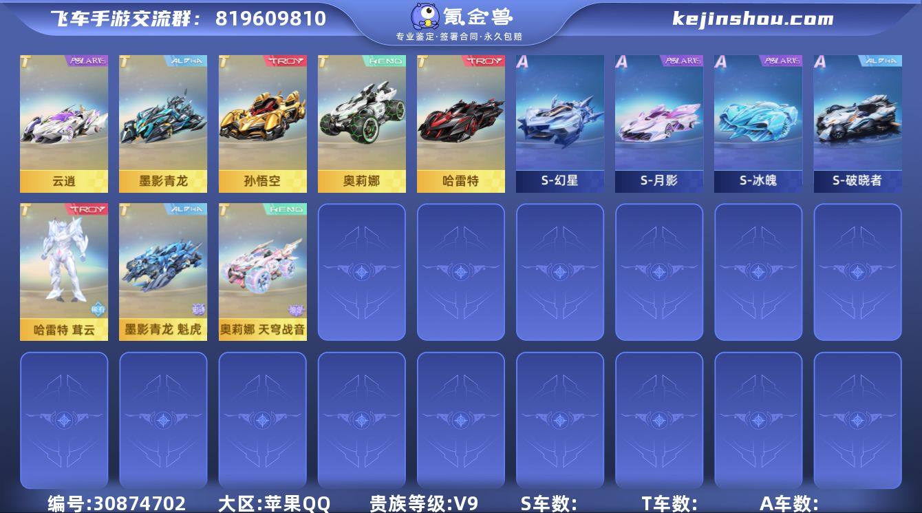 MCK630310 【9T/青龙舰长/云逍洛基/哈雷特雷震子/孙悟空神魔/源极哪吒/序列/奥莉娜+8联赛+6神宠+1男2女幻生-7男11女魔法套-男图1.7w女图1.8w】 A车数量130 游戏等级95 贵族等级13 车皮肤数量82 【苹果QQ】 【90天内转过(备注日期)】 【可修改】 【V13】 永久T车9 永久T车阶数皮肤3 永久T车皮肤9 永久A车9 S联赛车皮肤9 女魔法时装13 男魔法时装7 骑宠6 竞速宠22 道具宠25 永久T车:T源极之星EXA,T序列未来LYR,T孙悟空,T奥莉娜,T哈雷特,T墨影青龙,T云逍,T鸭宝超人,T蓝波豚宝; 永久T车阶数皮肤:奥莉娜天穹战音,哈雷特炽焰龙骑,墨影青龙敖丙; 永久T车皮肤:源极之星黑曜石,源极之星星穹之矢,序列未来梦魇,源极之星哪吒,哈雷特雷震子,孙悟空神魔一刹,哈雷特幽冥圣使,墨影青龙瑞廪舰长,云逍洛基; 永久A车:S逐星者,S裁决者,S天行者,凯蒂雷诺,S冰魄,S星煌,S时序使者,S月影,S幻星; S联赛车皮肤:冰魄冰晶,冰魄天使之羽,月影星翼,月影星澜,冰魄大花袄,月影大花袄,幻星RSG,幻星溯流,月影澜炽; 女魔法时装:(幻生)穹梦韶宇女装,(幻生)拂光掠影女装,星轨来信女装,清梦缱绻女装,瑶海汐音女装,青丘九尾女装,沧海梦境女装,创世之神女装,幻蝶女装,鲸徊夜梦女装,鎏龙神音女装,虎跃乾坤女装,灵隐侠狐女装; 男魔法时装:(幻生)拂光掠影男装,明日之诗男装,鎏龙神音男装,灵隐侠狐男装,鲸徊夜梦男装,死神男装,幻蝶男装; 骑宠:瑞泽祥麟,加鲁鲁兽,帝皇魂狮,火狱龙息,冰晶独角兽,御天龙神; 竞速宠:白龙马,小桃夭,无常小黑,哪吒,饕餮,嫦娥七号,女娲,源梦之星,魔王天狮,雀焰女王,玉玺神虎,涂鸦精灵,星轨来信·溯光,魔法星喵,星魂十夜,醉梦仙子,金凯傲甲,星萌仙使,莲蛇仙子,叮当花鼠,潮汐之灵,雪熊灵宝; 道具宠:极地龙龟,蓬莱仙鹿,青鸾,彩虹...