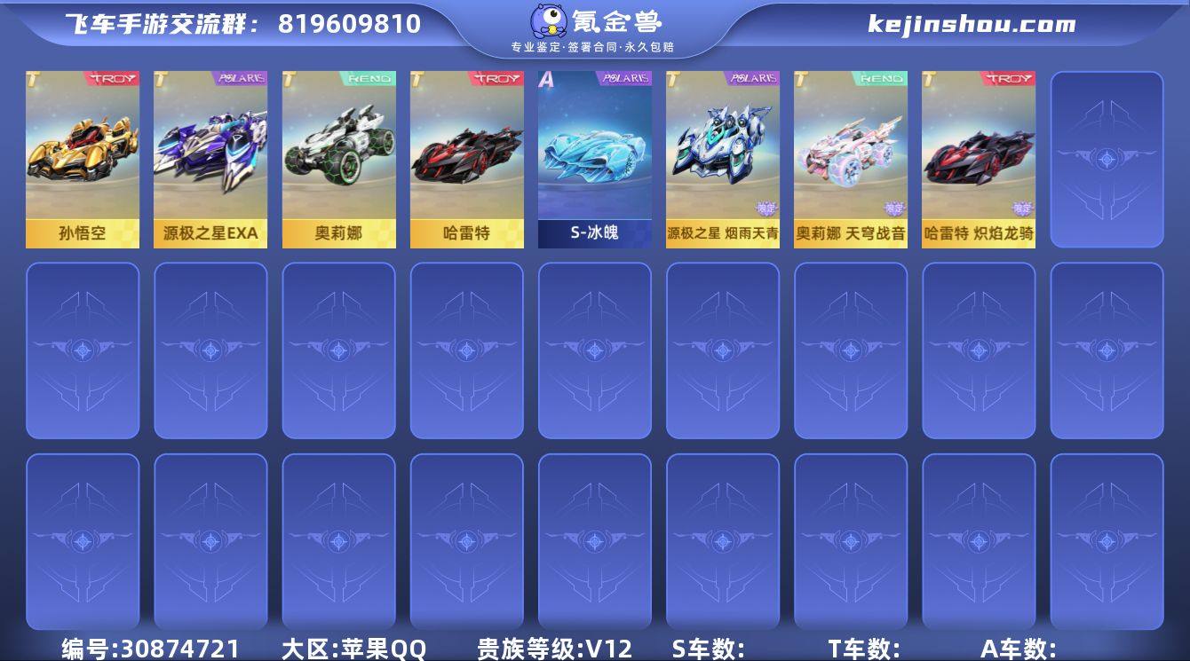 MCK630310 【9T/青龙舰长/云逍洛基/哈雷特雷震子/孙悟空神魔/源极哪吒/序列/奥莉娜+8联赛+6神宠+1男2女幻生-7男11女魔法套-男图1.7w女图1.8w】 A车数量130 游戏等级95 贵族等级13 车皮肤数量82 【苹果QQ】 【90天内转过(备注日期)】 【可修改】 【V13】 永久T车9 永久T车阶数皮肤3 永久T车皮肤9 永久A车9 S联赛车皮肤9 女魔法时装13 男魔法时装7 骑宠6 竞速宠22 道具宠25 永久T车:T源极之星EXA,T序列未来LYR,T孙悟空,T奥莉娜,T哈雷特,T墨影青龙,T云逍,T鸭宝超人,T蓝波豚宝; 永久T车阶数皮肤:奥莉娜天穹战音,哈雷特炽焰龙骑,墨影青龙敖丙; 永久T车皮肤:源极之星黑曜石,源极之星星穹之矢,序列未来梦魇,源极之星哪吒,哈雷特雷震子,孙悟空神魔一刹,哈雷特幽冥圣使,墨影青龙瑞廪舰长,云逍洛基; 永久A车:S逐星者,S裁决者,S天行者,凯蒂雷诺,S冰魄,S星煌,S时序使者,S月影,S幻星; S联赛车皮肤:冰魄冰晶,冰魄天使之羽,月影星翼,月影星澜,冰魄大花袄,月影大花袄,幻星RSG,幻星溯流,月影澜炽; 女魔法时装:(幻生)穹梦韶宇女装,(幻生)拂光掠影女装,星轨来信女装,清梦缱绻女装,瑶海汐音女装,青丘九尾女装,沧海梦境女装,创世之神女装,幻蝶女装,鲸徊夜梦女装,鎏龙神音女装,虎跃乾坤女装,灵隐侠狐女装; 男魔法时装:(幻生)拂光掠影男装,明日之诗男装,鎏龙神音男装,灵隐侠狐男装,鲸徊夜梦男装,死神男装,幻蝶男装; 骑宠:瑞泽祥麟,加鲁鲁兽,帝皇魂狮,火狱龙息,冰晶独角兽,御天龙神; 竞速宠:白龙马,小桃夭,无常小黑,哪吒,饕餮,嫦娥七号,女娲,源梦之星,魔王天狮,雀焰女王,玉玺神虎,涂鸦精灵,星轨来信·溯光,魔法星喵,星魂十夜,醉梦仙子,金凯傲甲,星萌仙使,莲蛇仙子,叮当花鼠,潮汐之灵,雪熊灵宝; 道具宠:极地龙龟,蓬莱仙鹿,青鸾,彩虹...
